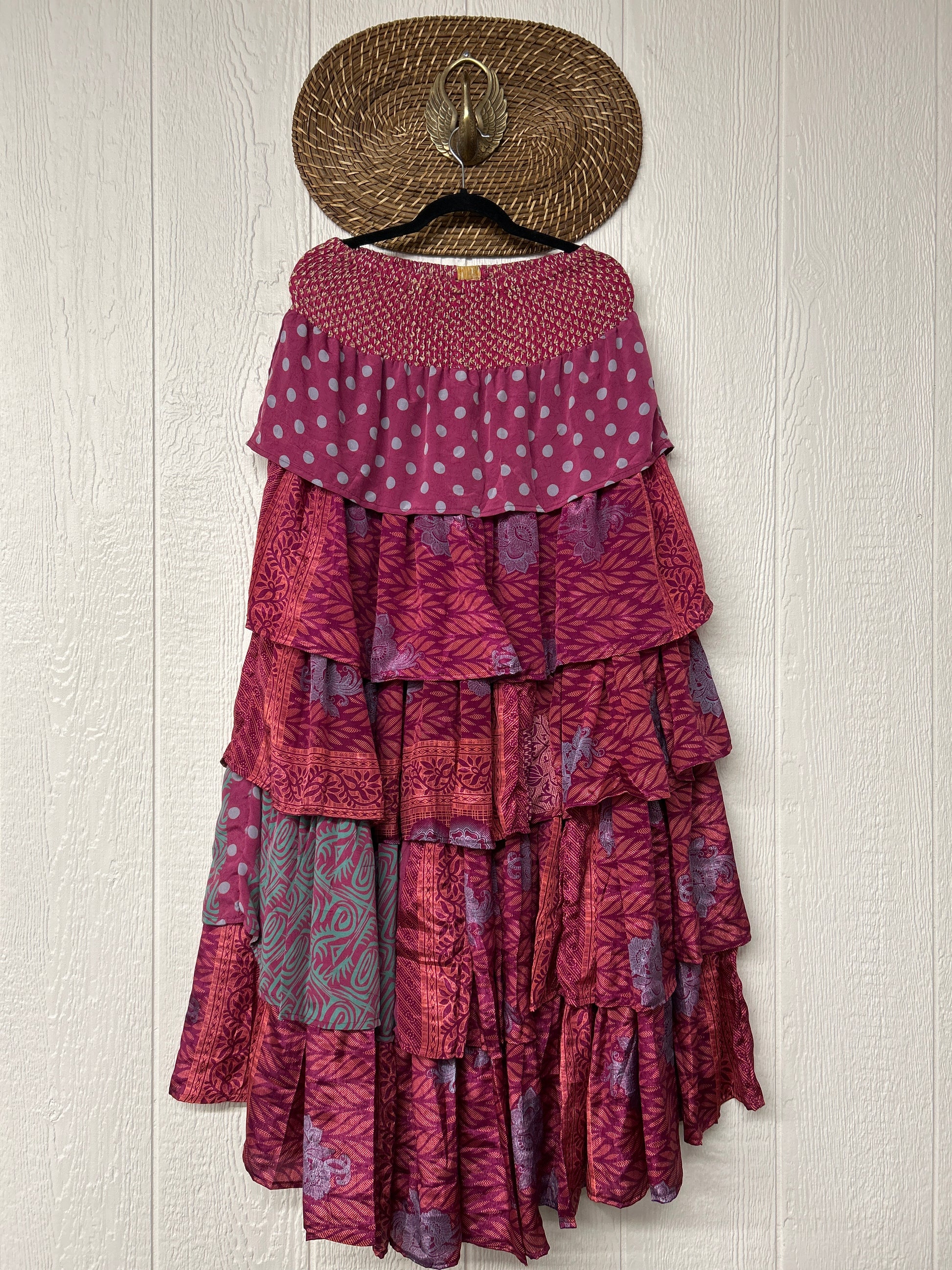 Crafted from vintage rasgulla sari, this ethereal piece features a stretchy ruffle waistband, a tiered floaty ruffle skirt.
