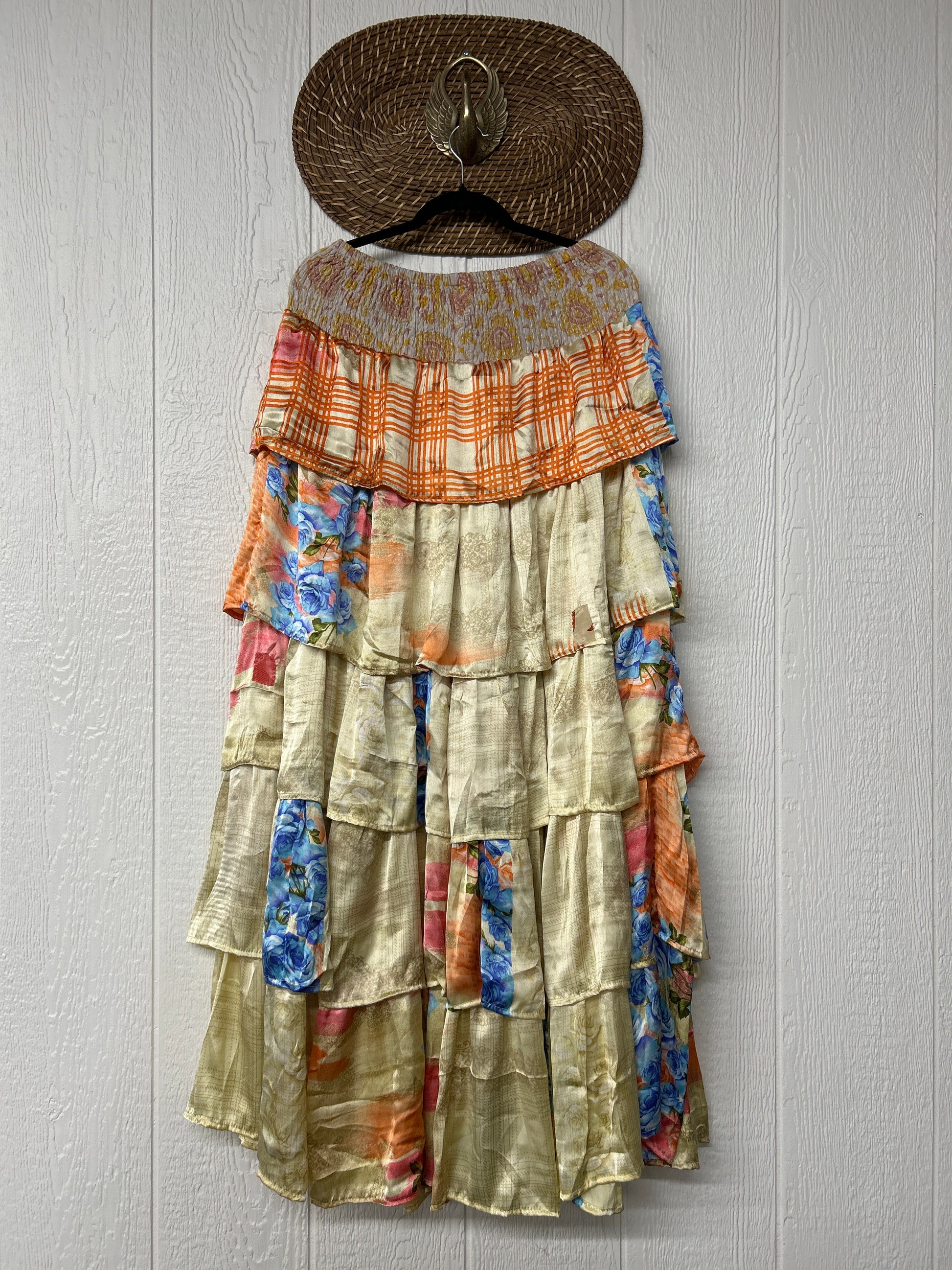 Crafted from vintage rasgulla sari, this ethereal piece features a stretchy ruffle waistband, a tiered floaty ruffle skirt.