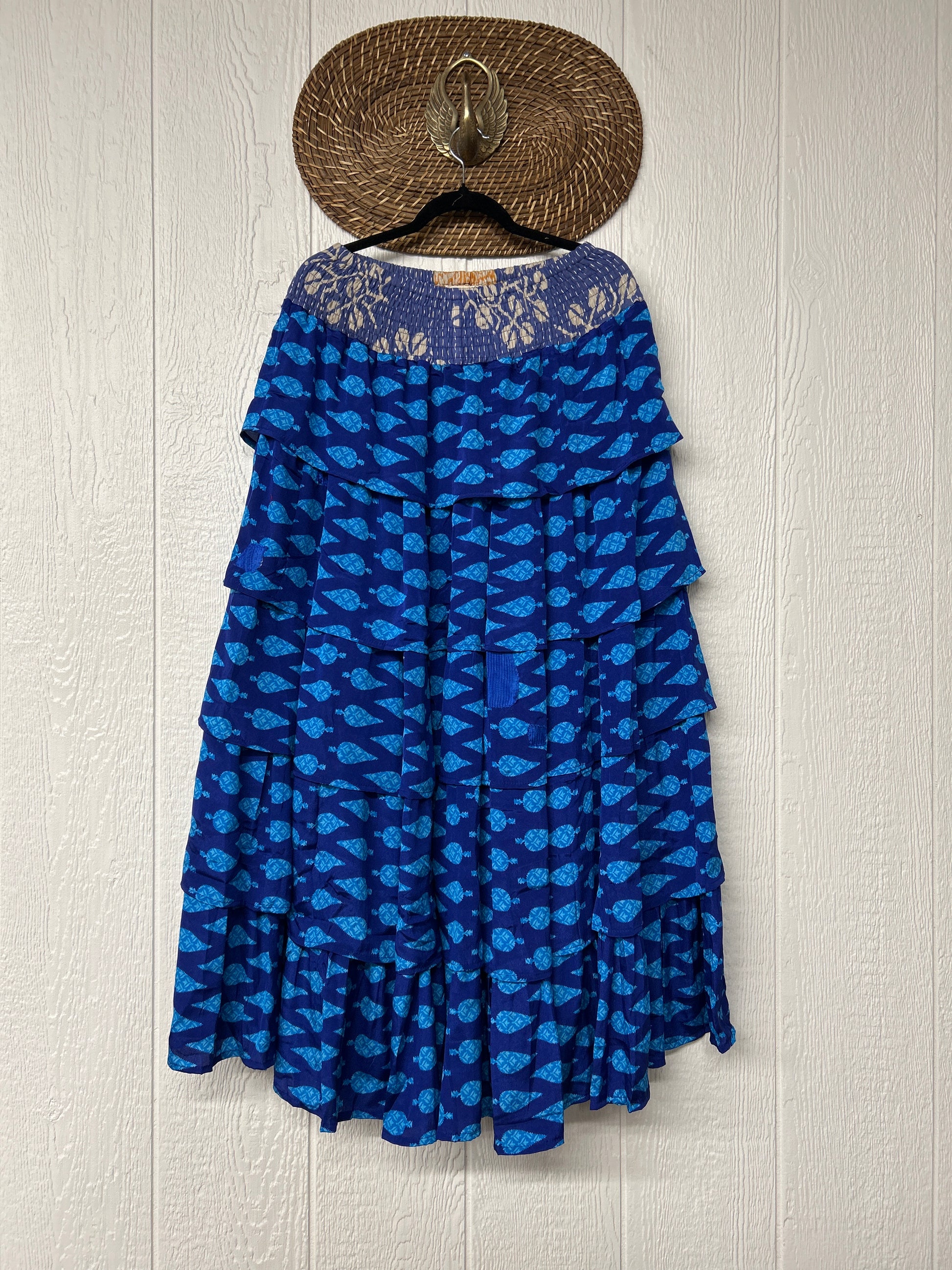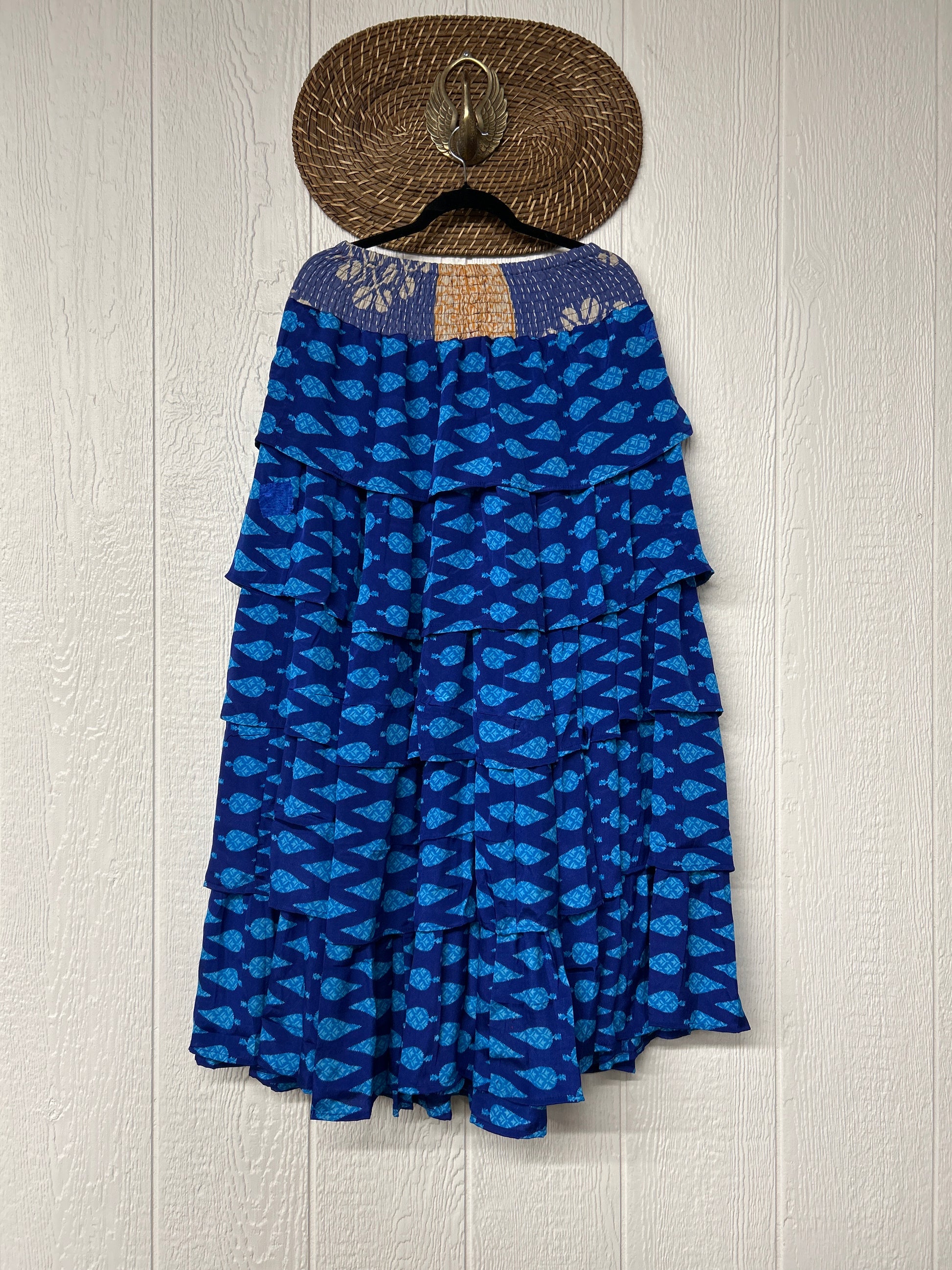 Crafted from vintage rasgulla sari, this ethereal piece features a stretchy ruffle waistband, a tiered floaty ruffle skirt.