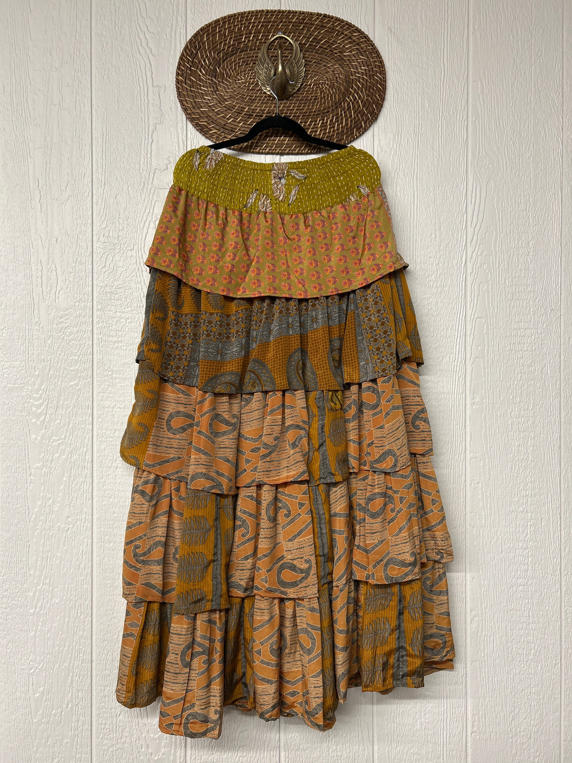 Crafted from vintage rasgulla sari, this ethereal piece features a stretchy ruffle waistband, a tiered floaty ruffle skirt.