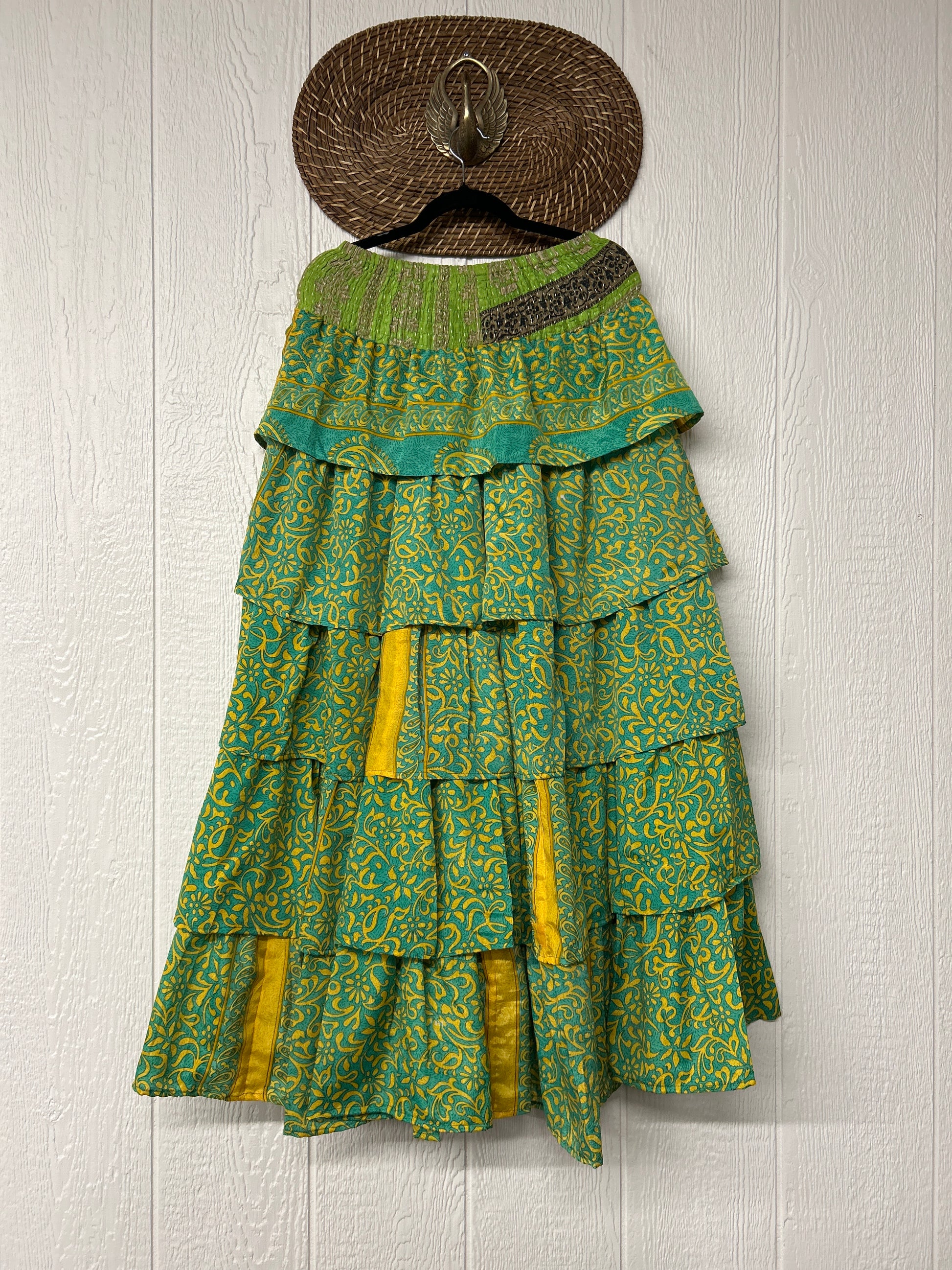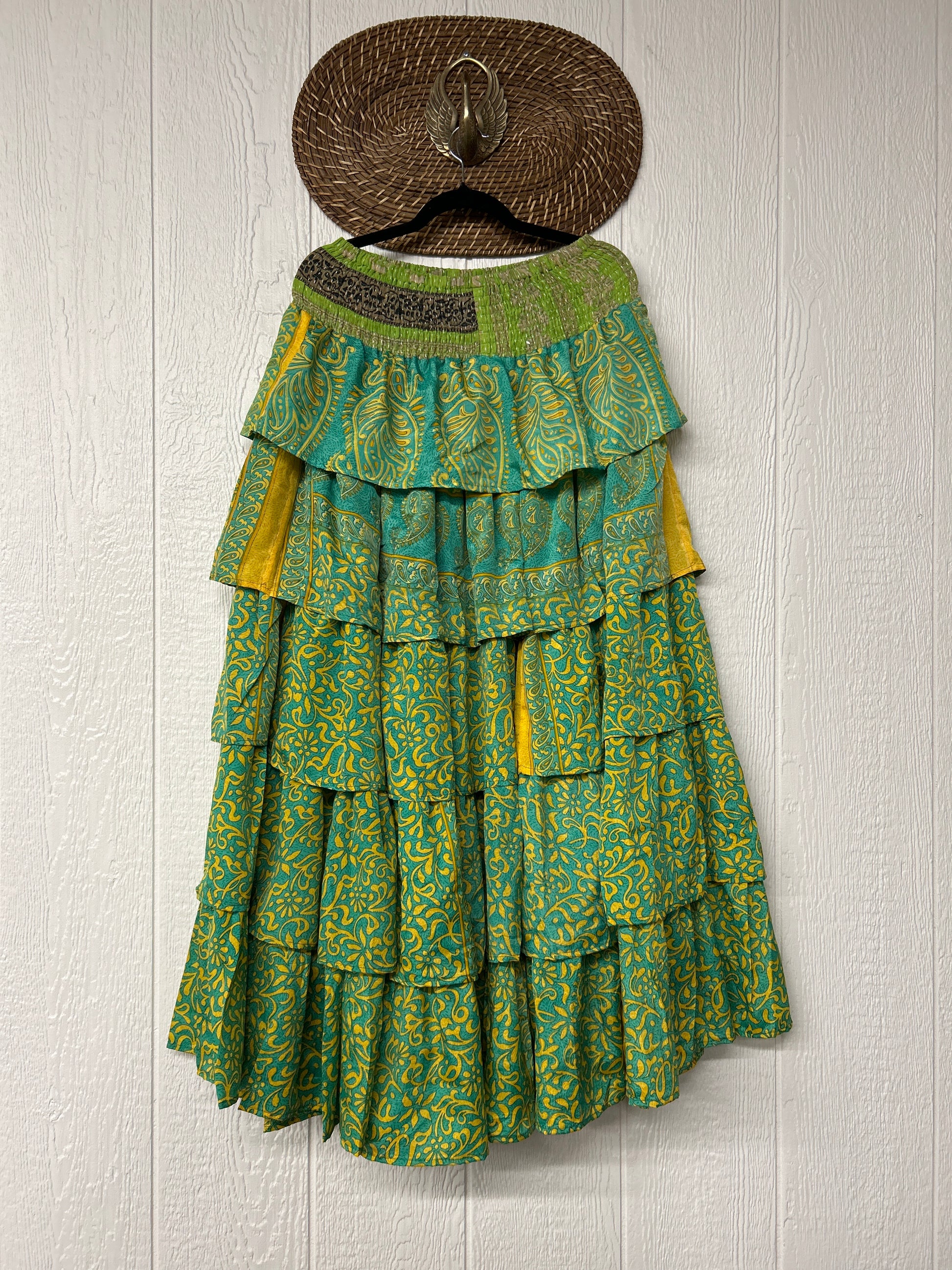 Crafted from vintage rasgulla sari, this ethereal piece features a stretchy ruffle waistband, a tiered floaty ruffle skirt.