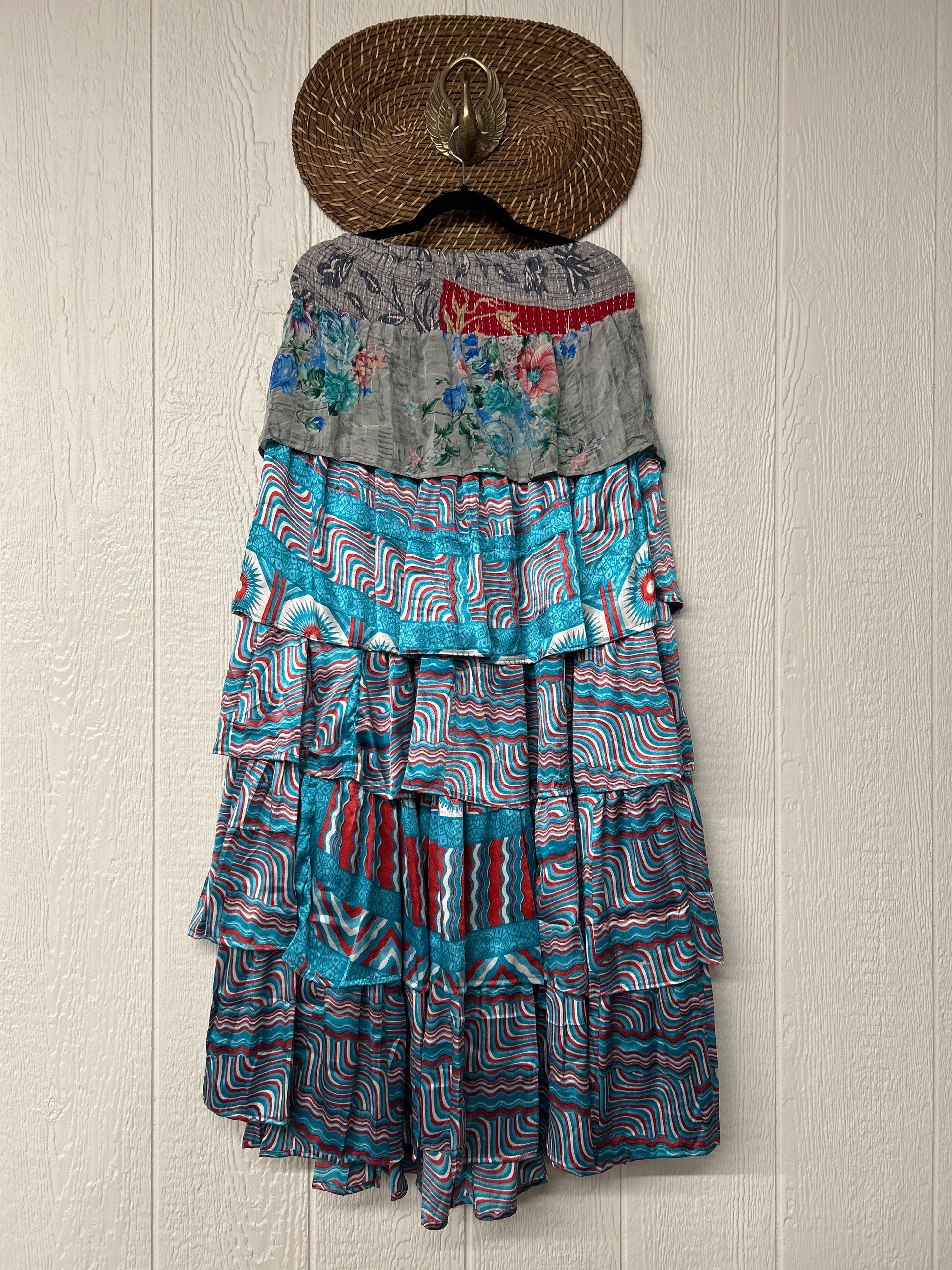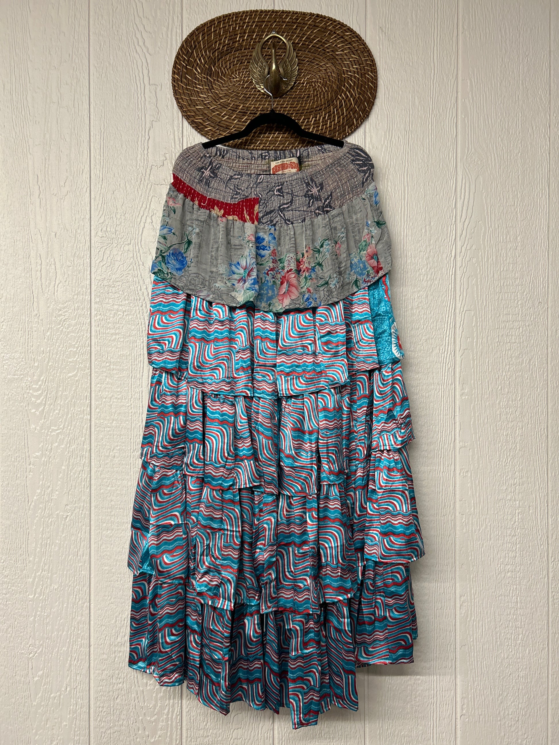 Crafted from vintage rasgulla sari, this ethereal piece features a stretchy ruffle waistband, a tiered floaty ruffle skirt.