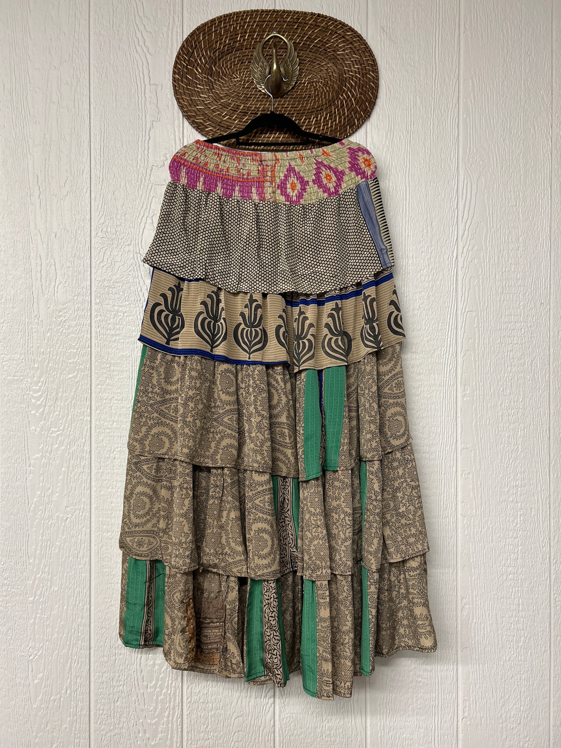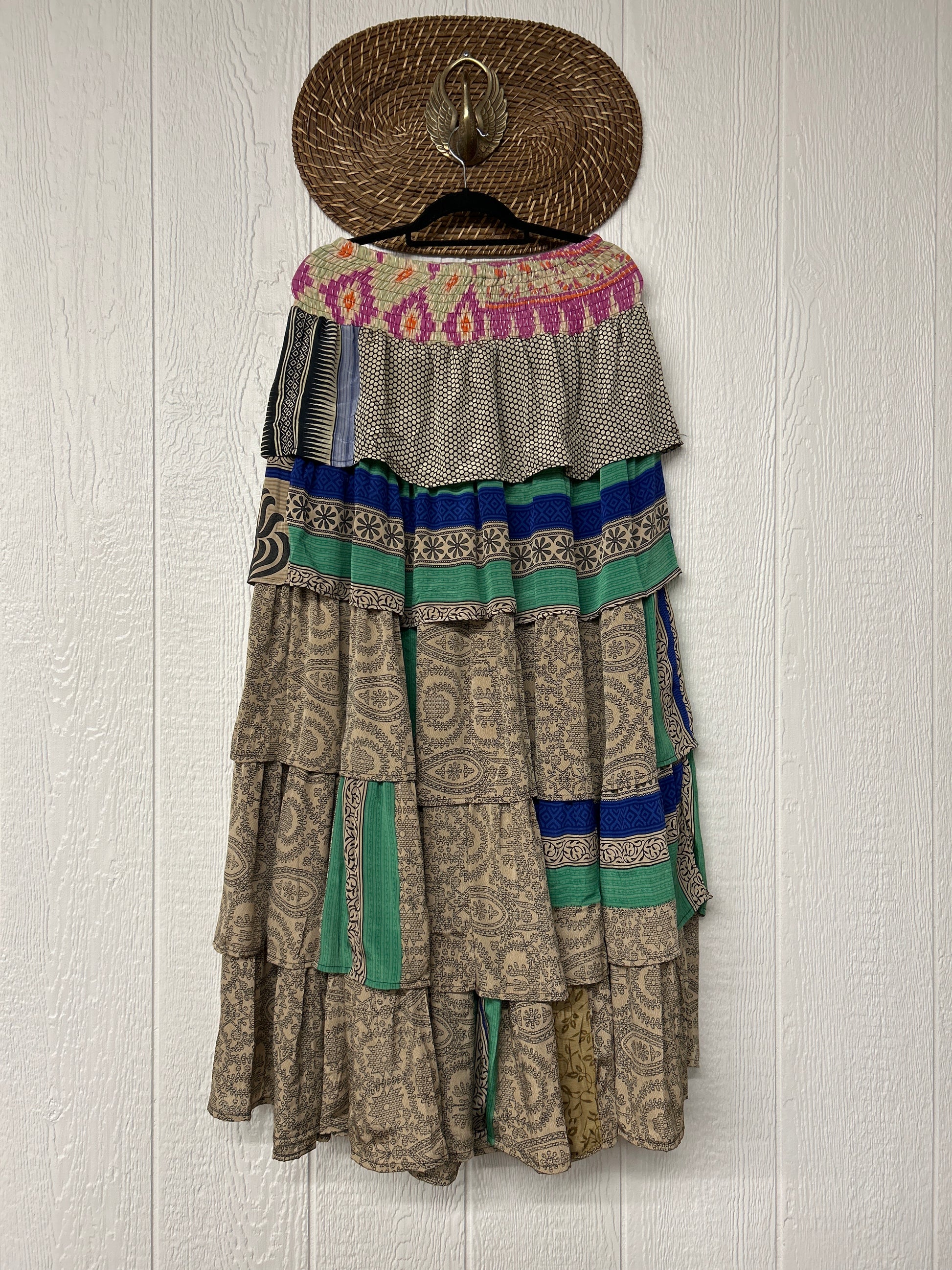 Crafted from vintage rasgulla sari, this ethereal piece features a stretchy ruffle waistband, a tiered floaty ruffle skirt.
