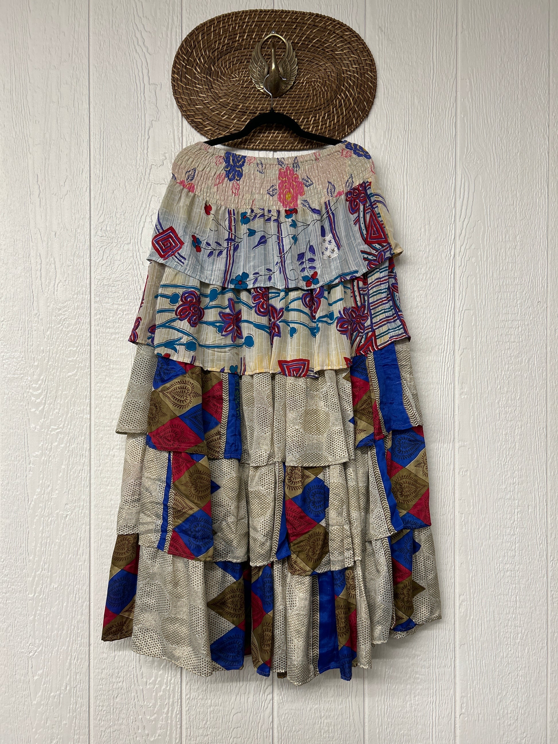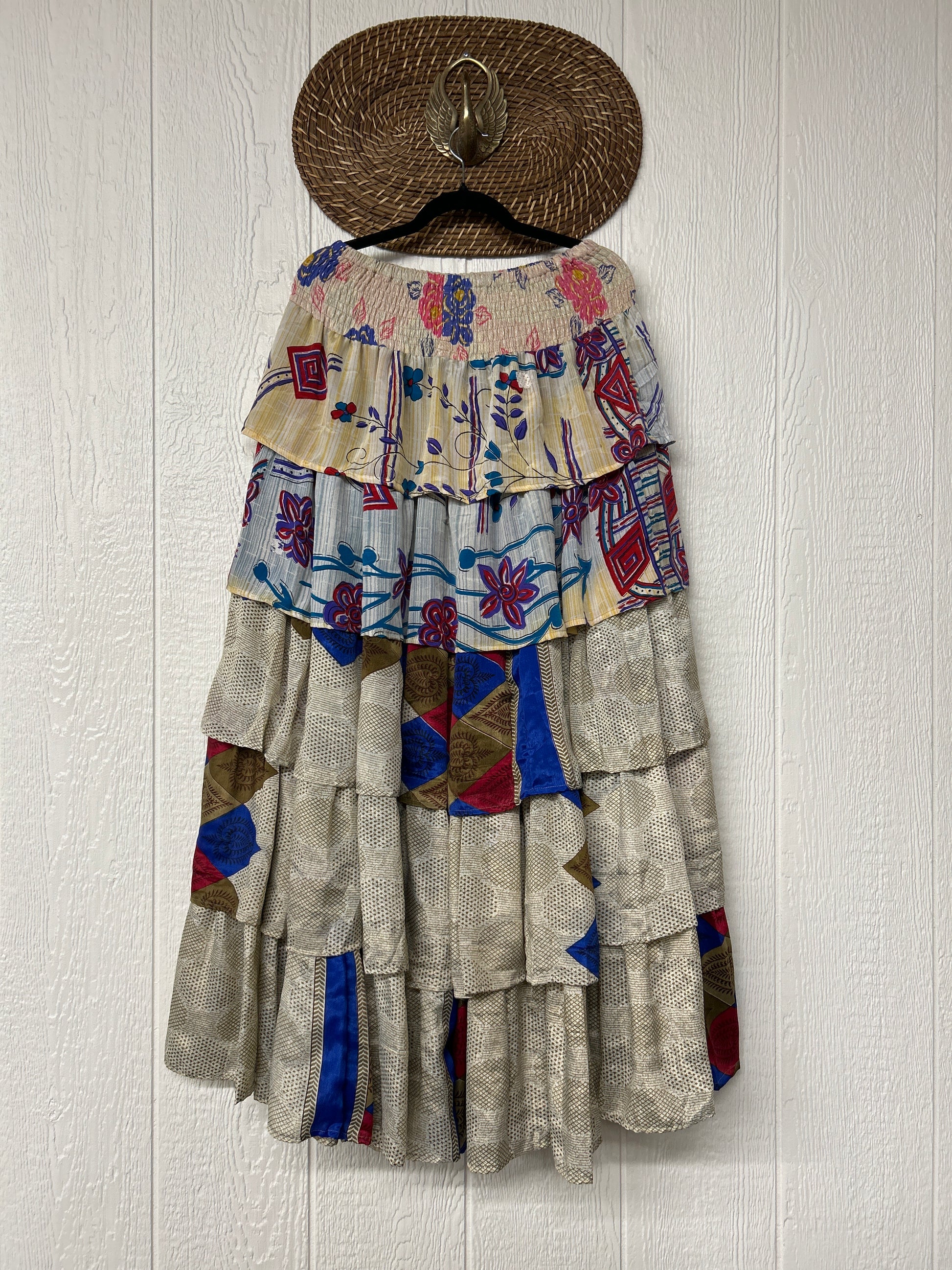 Crafted from vintage rasgulla sari, this ethereal piece features a stretchy ruffle waistband, a tiered floaty ruffle skirt.