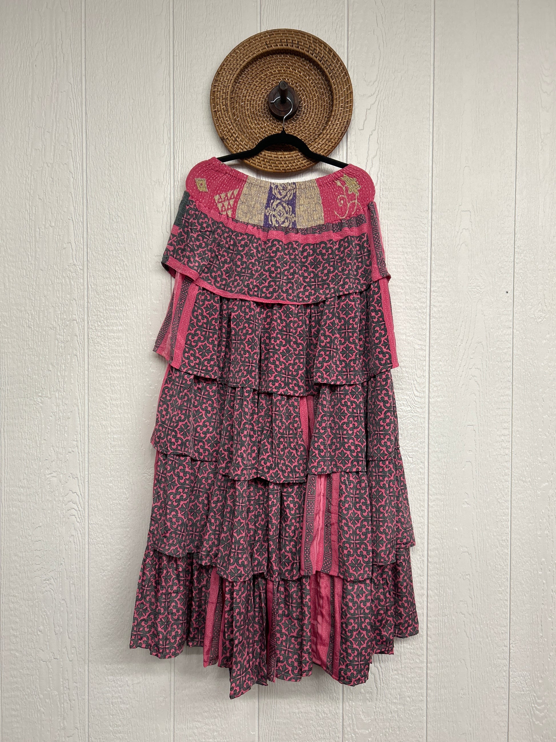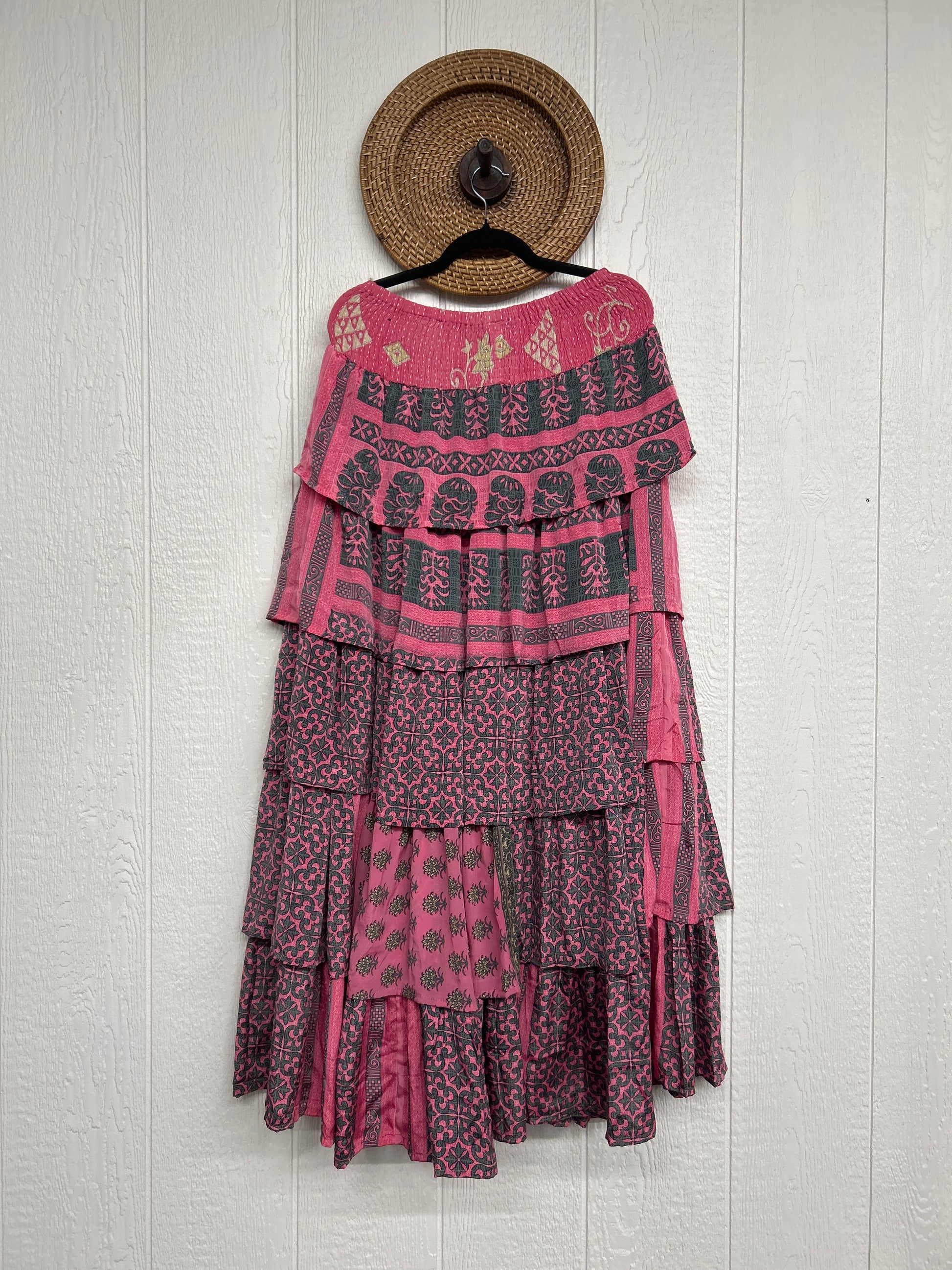 Crafted from vintage rasgulla sari, this ethereal piece features a stretchy ruffle waistband, a tiered floaty ruffle skirt.