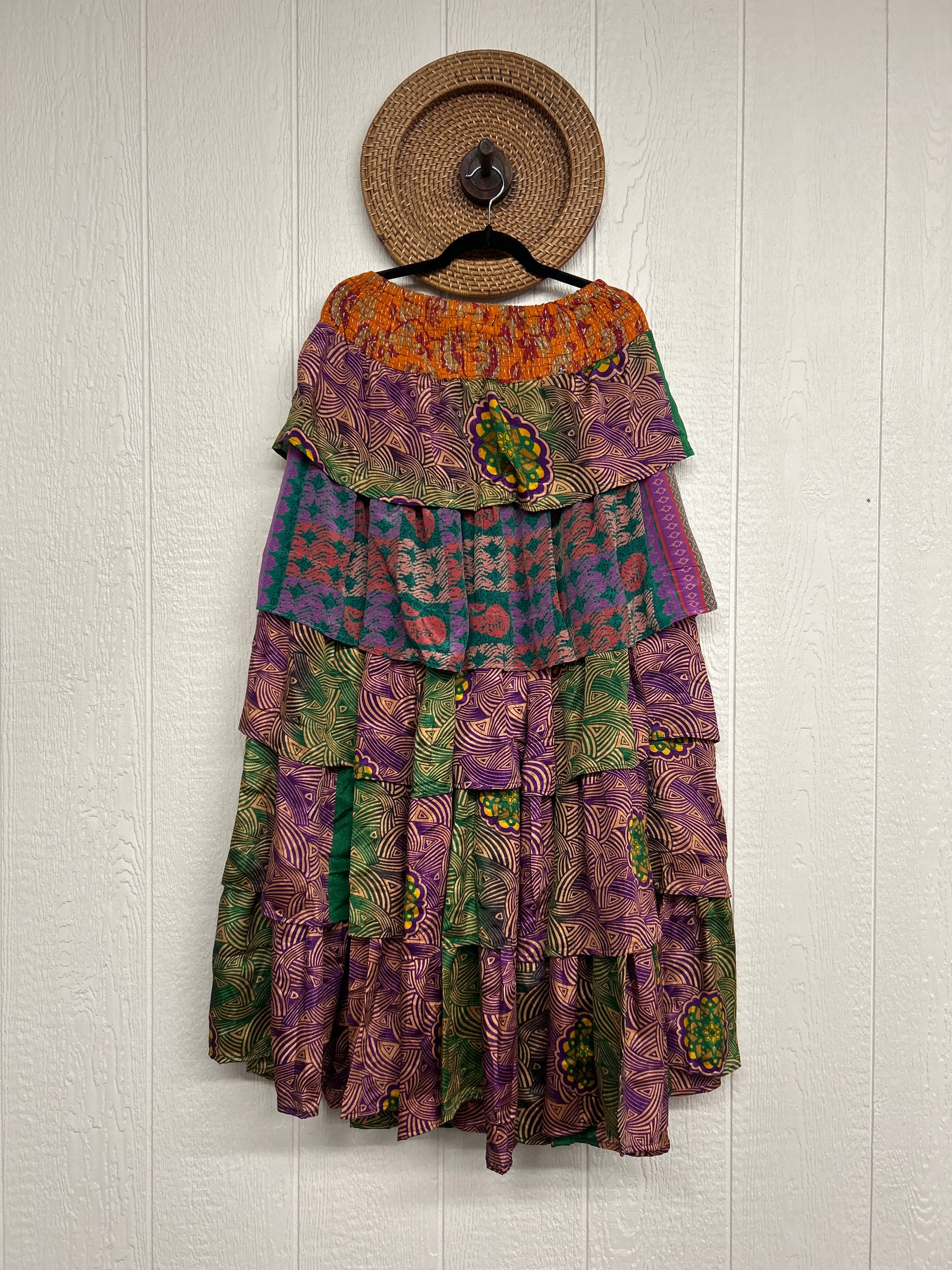 Crafted from vintage rasgulla sari, this ethereal piece features a stretchy ruffle waistband, a tiered floaty ruffle skirt.