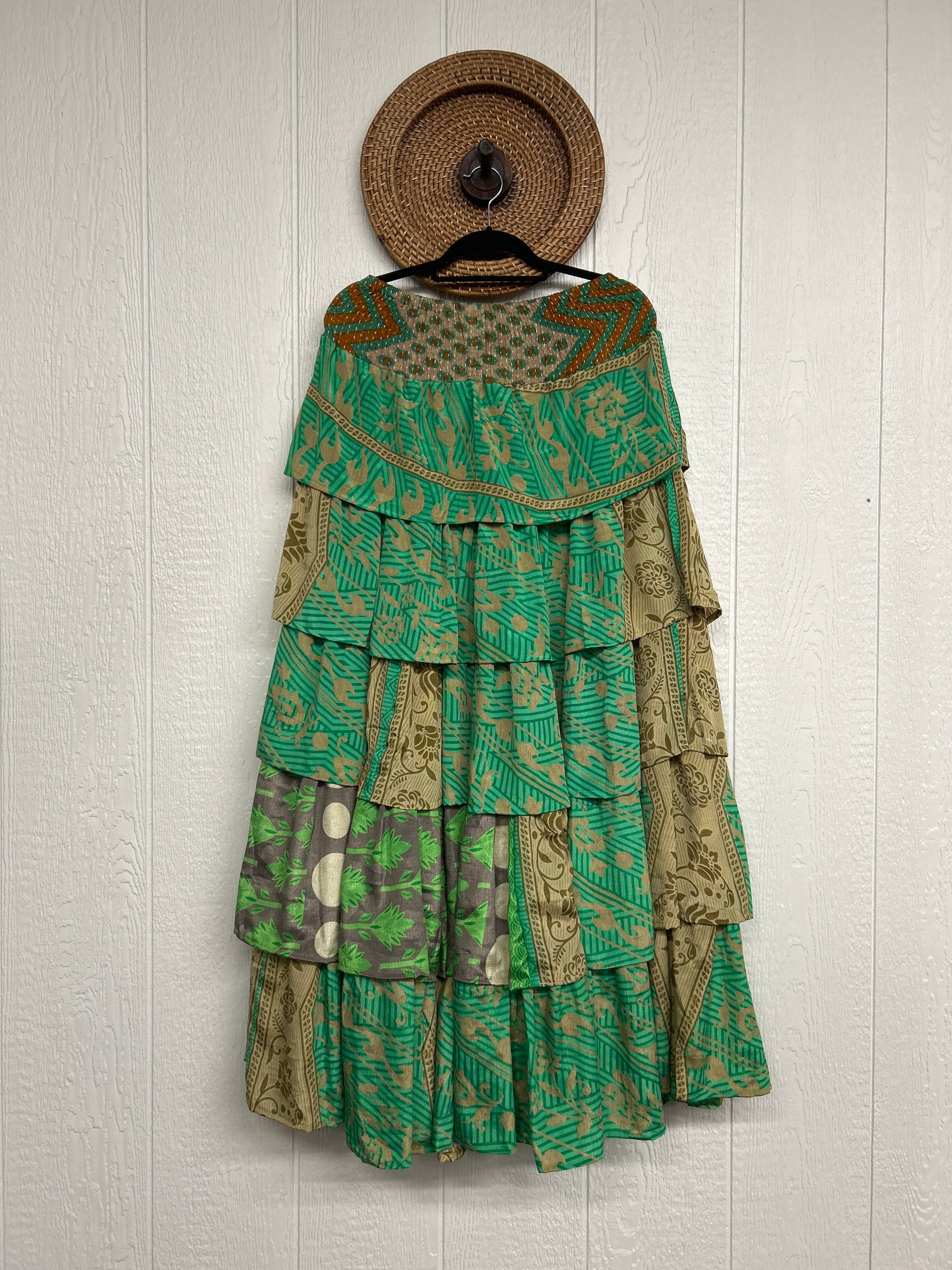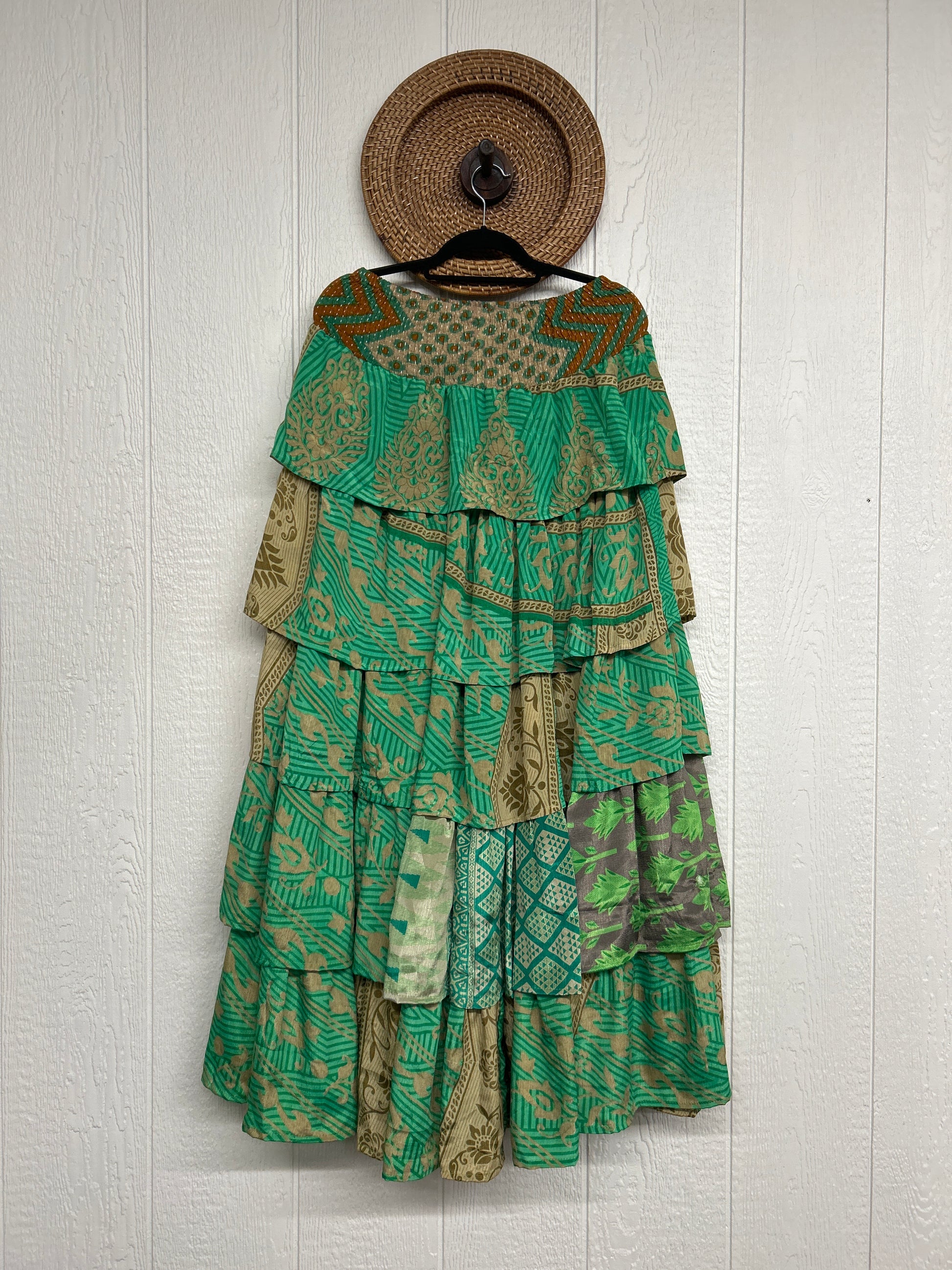 Crafted from vintage rasgulla sari, this ethereal piece features a stretchy ruffle waistband, a tiered floaty ruffle skirt.