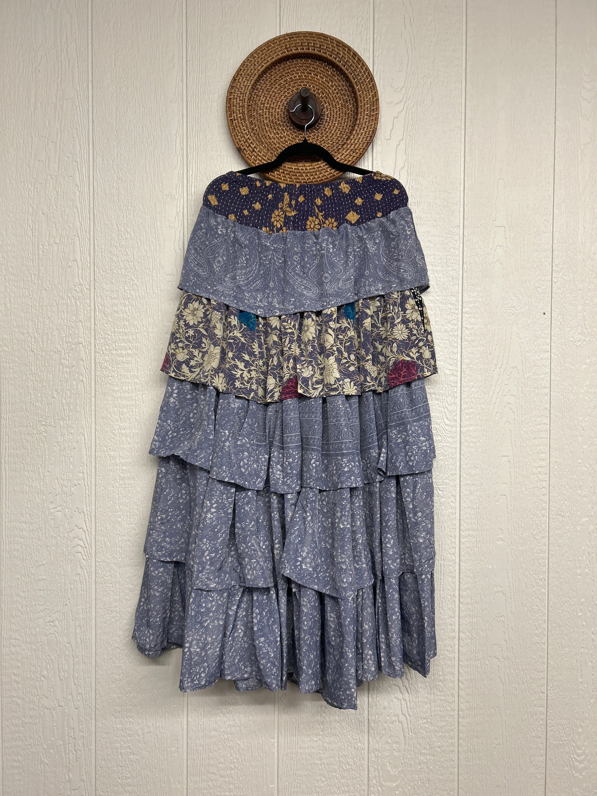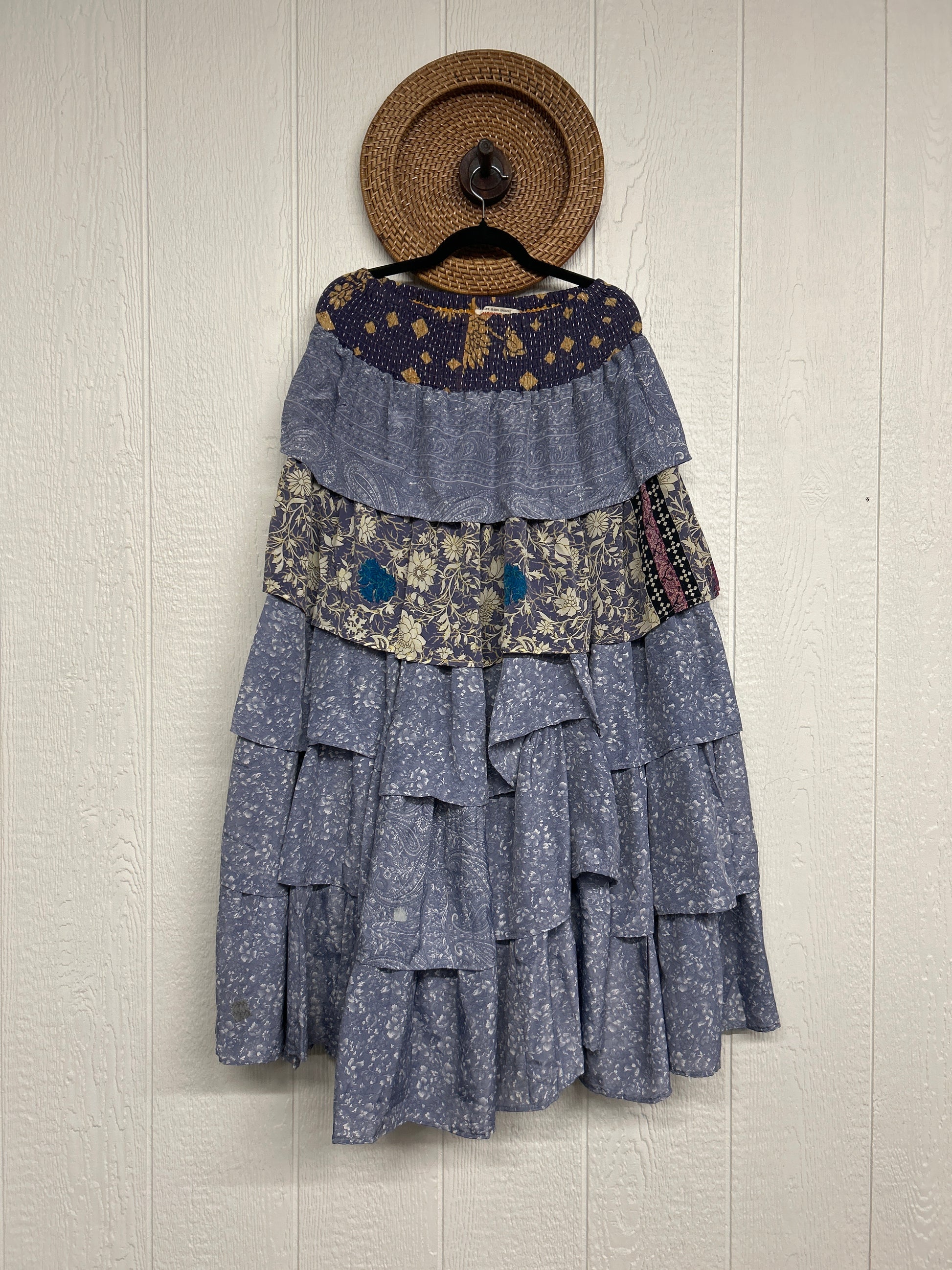 Crafted from vintage rasgulla sari, this ethereal piece features a stretchy ruffle waistband, a tiered floaty ruffle skirt.