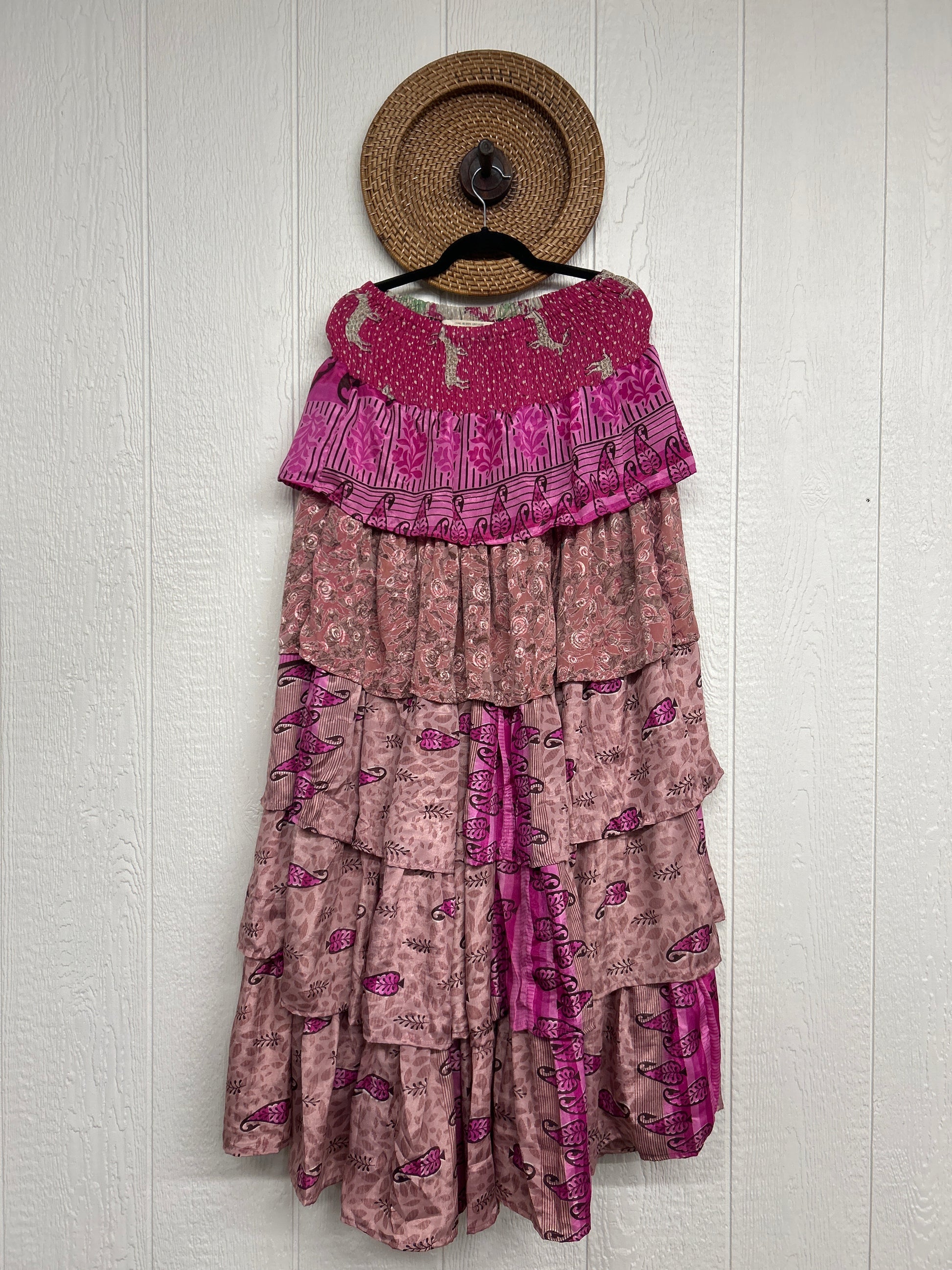 Crafted from vintage rasgulla sari, this ethereal piece features a stretchy ruffle waistband, a tiered floaty ruffle skirt.