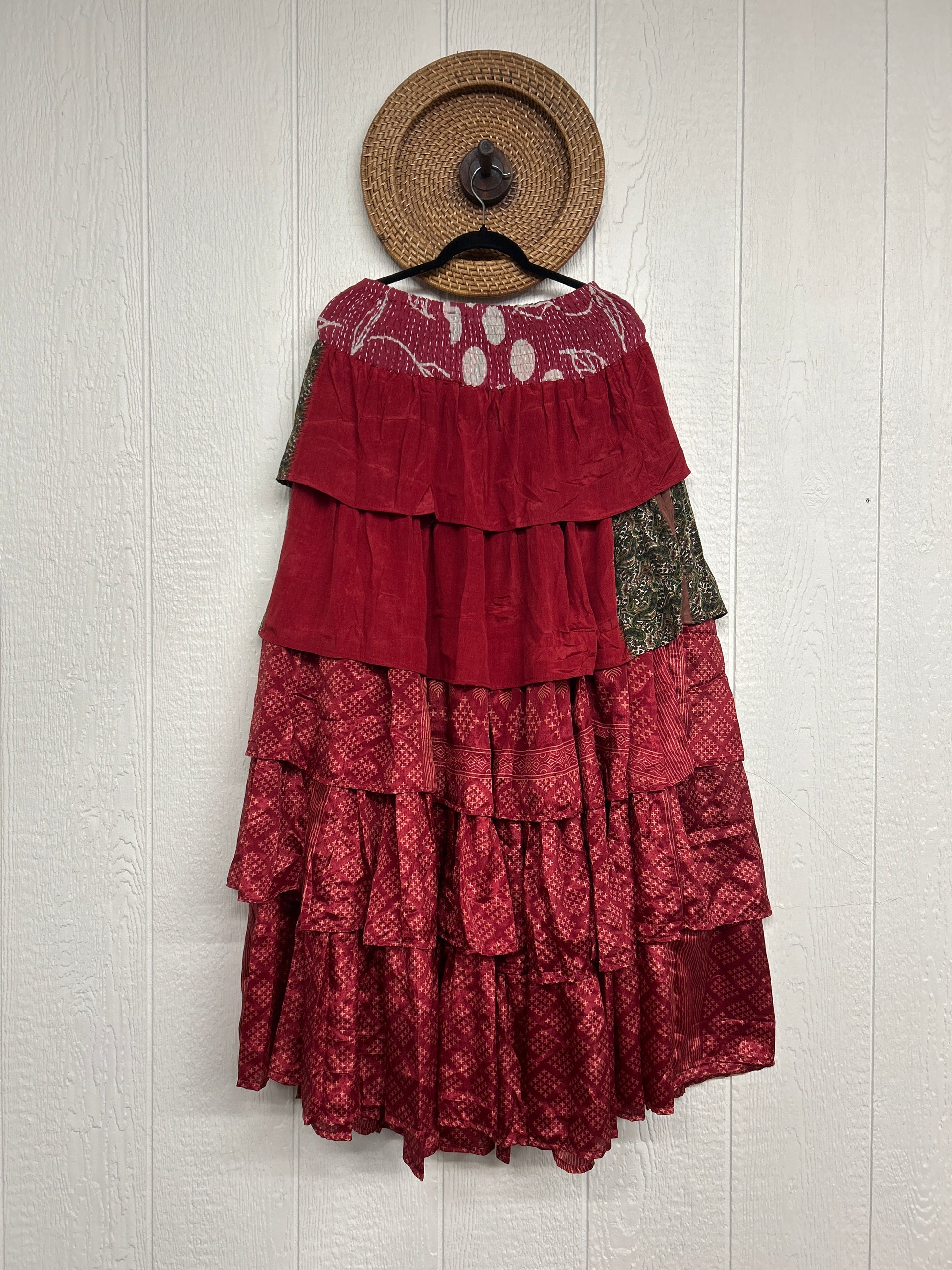 Crafted from vintage rasgulla sari, this ethereal piece features a stretchy ruffle waistband, a tiered floaty ruffle skirt.
