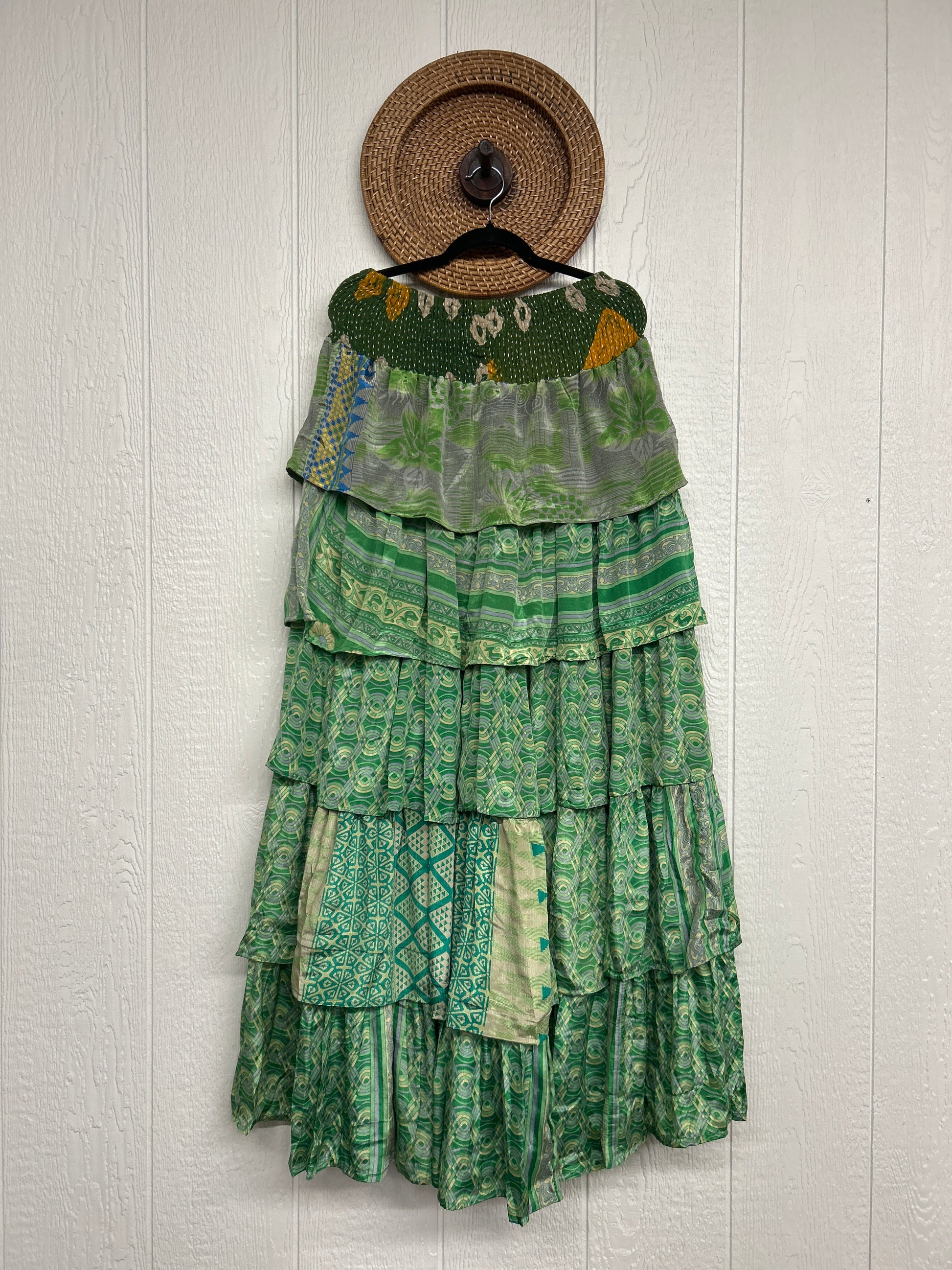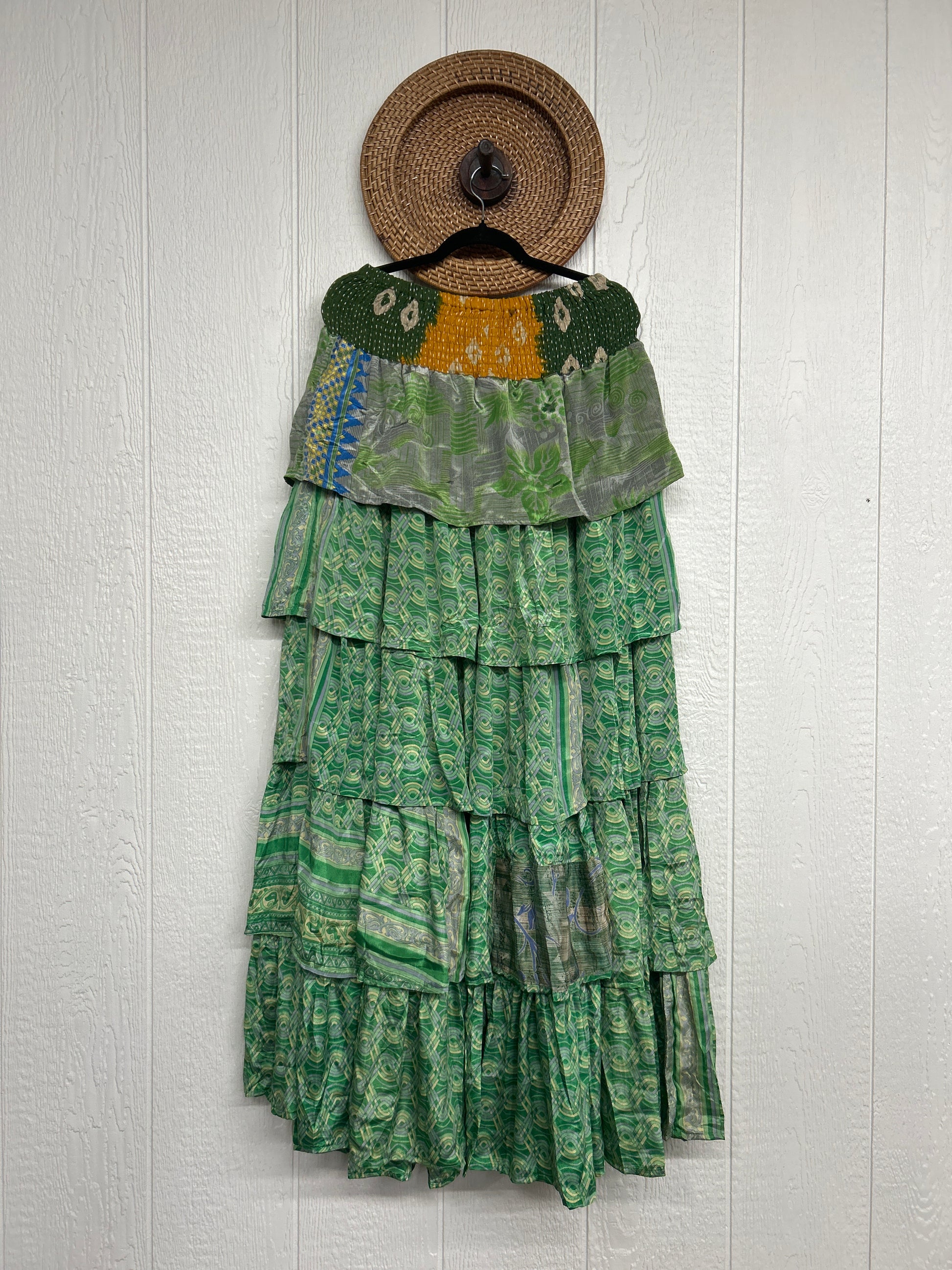 Crafted from vintage rasgulla sari, this ethereal piece features a stretchy ruffle waistband, a tiered floaty ruffle skirt.
