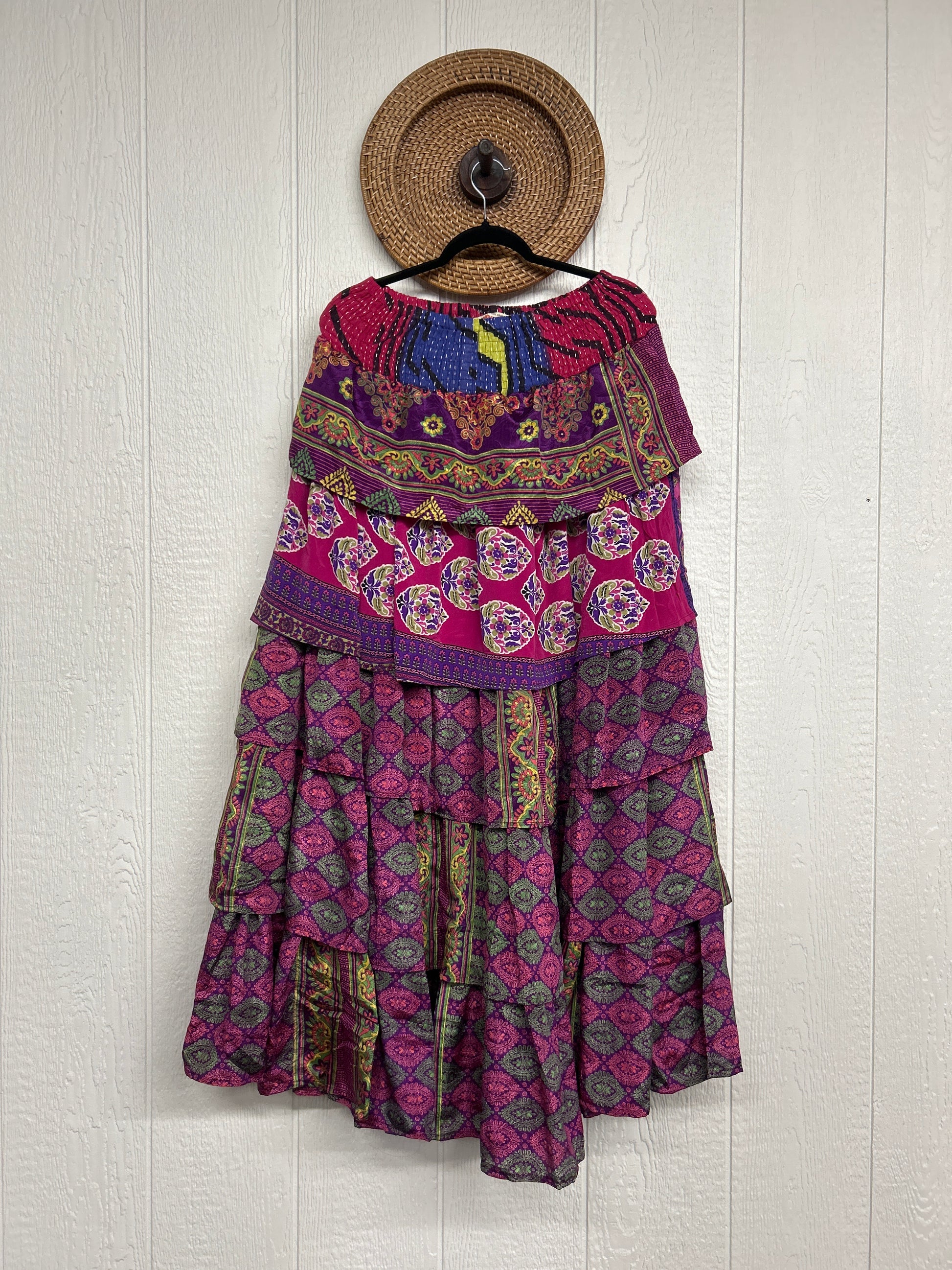 Crafted from vintage rasgulla sari, this ethereal piece features a stretchy ruffle waistband, a tiered floaty ruffle skirt.