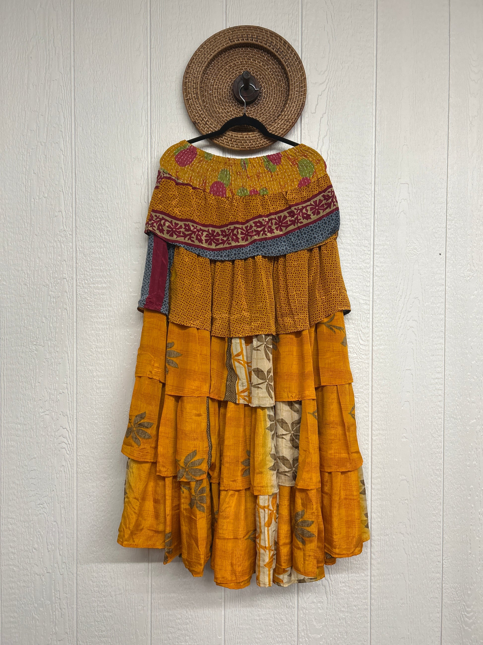 Crafted from vintage rasgulla sari, this ethereal piece features a stretchy ruffle waistband, a tiered floaty ruffle skirt.