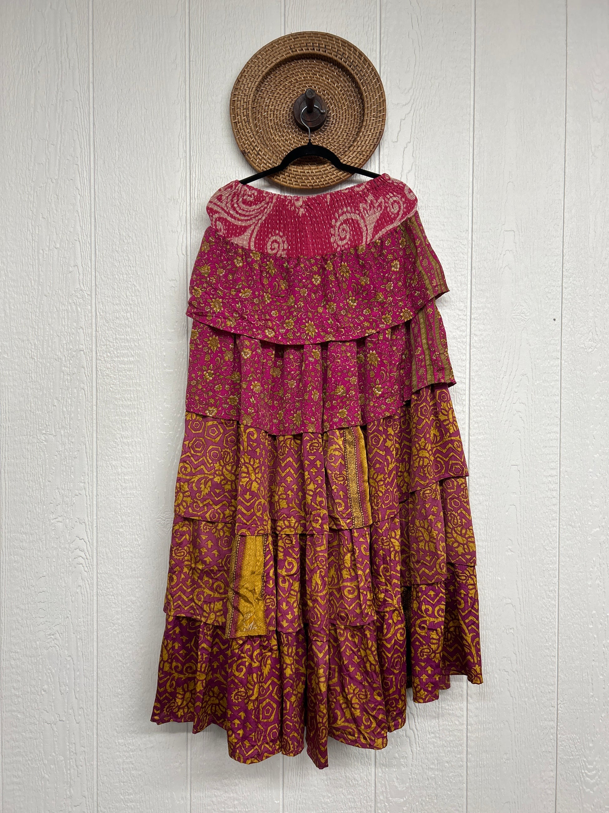 Crafted from vintage rasgulla sari, this ethereal piece features a stretchy ruffle waistband, a tiered floaty ruffle skirt.
