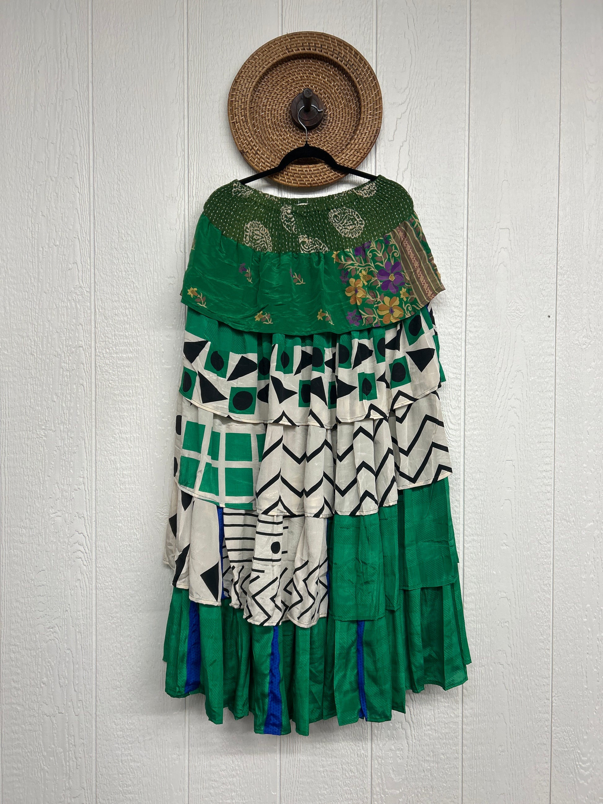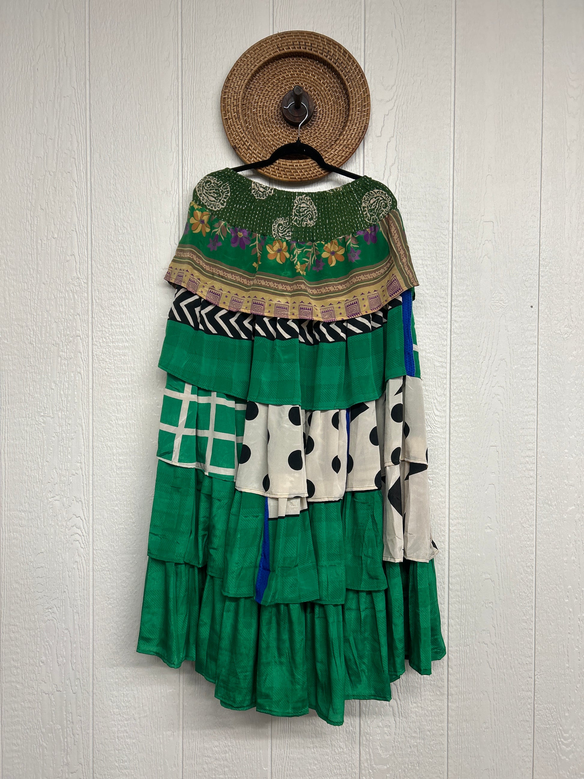 Crafted from vintage rasgulla sari, this ethereal piece features a stretchy ruffle waistband, a tiered floaty ruffle skirt.