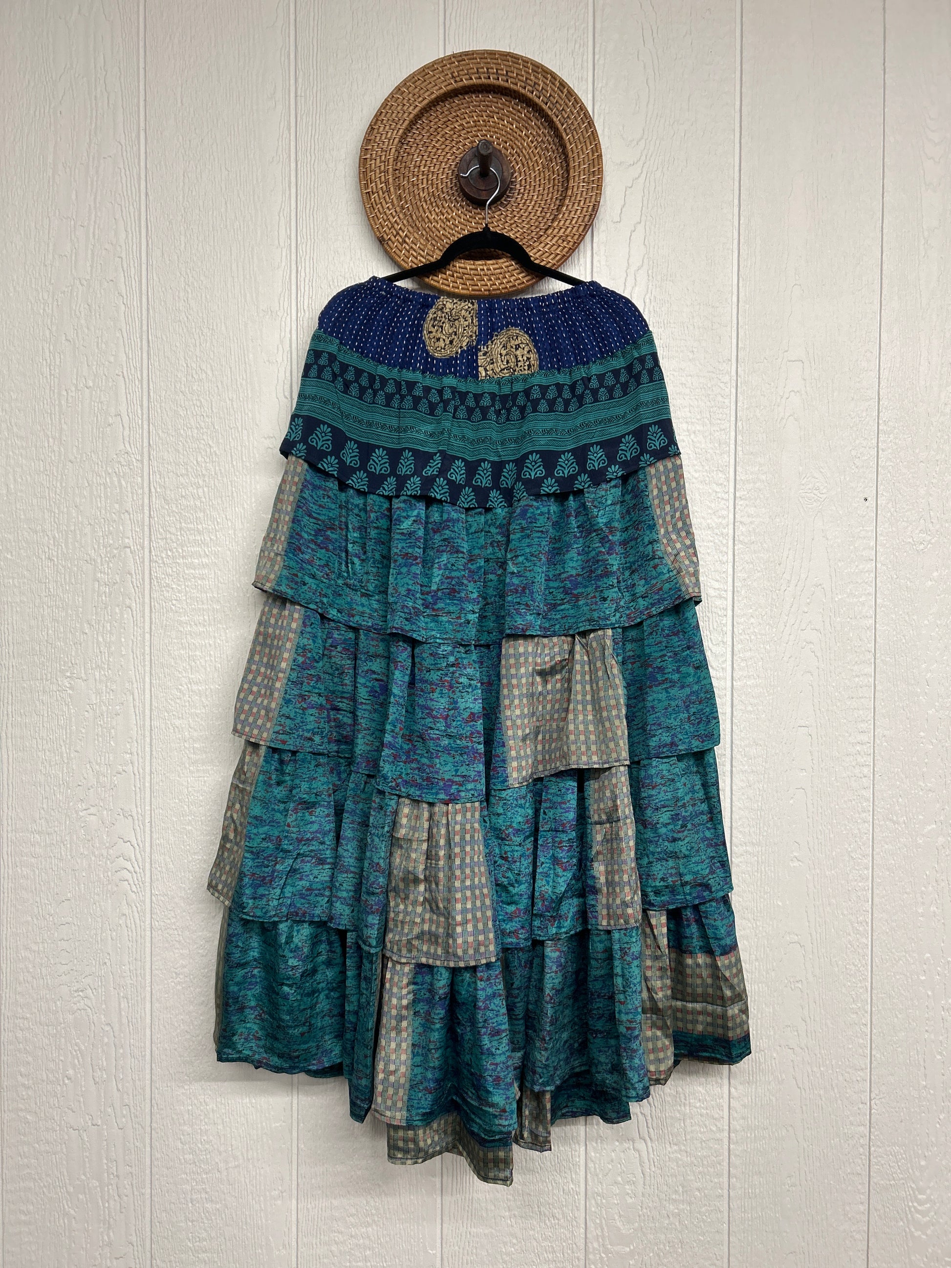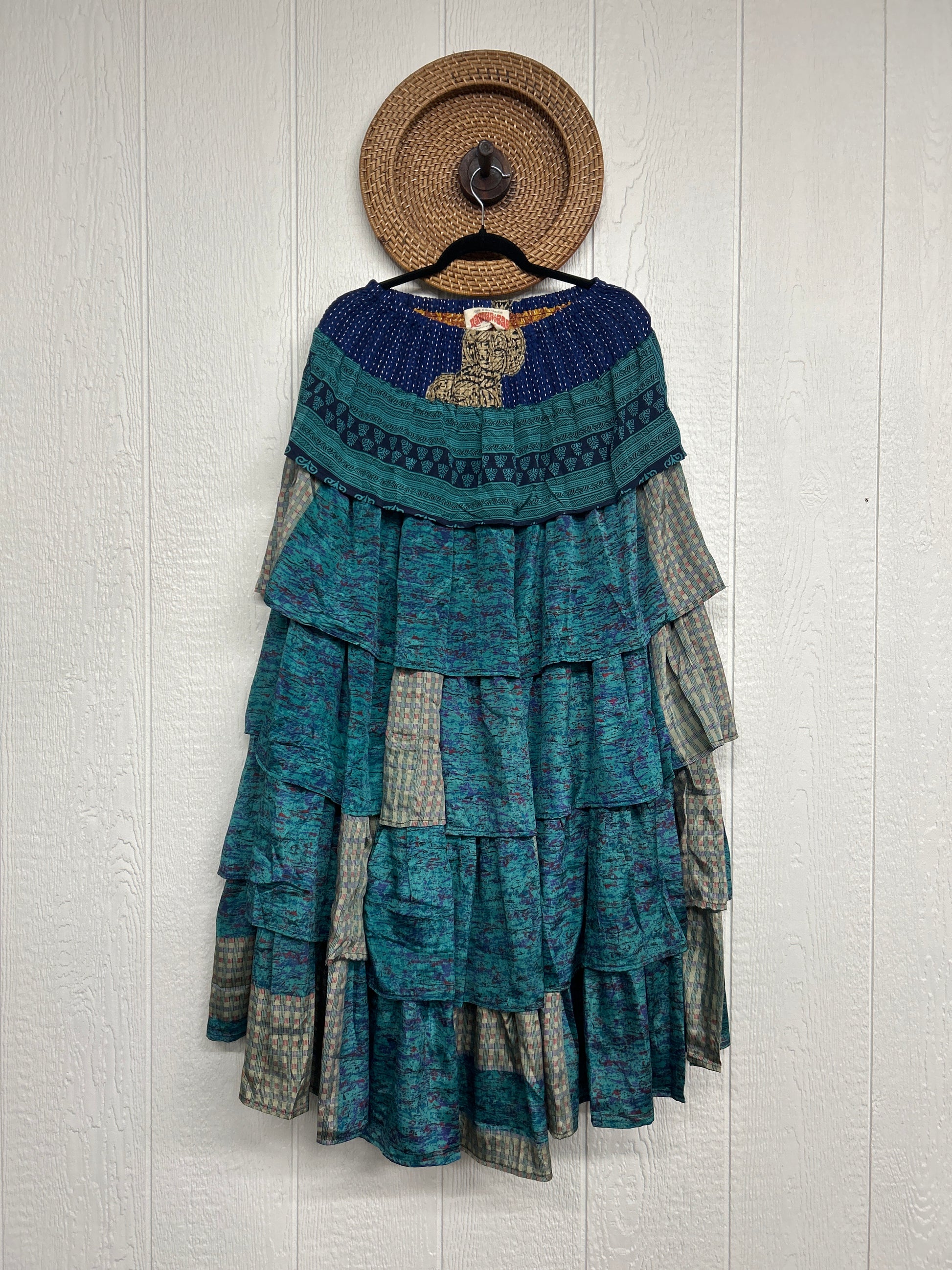 Crafted from vintage rasgulla sari, this ethereal piece features a stretchy ruffle waistband, a tiered floaty ruffle skirt.