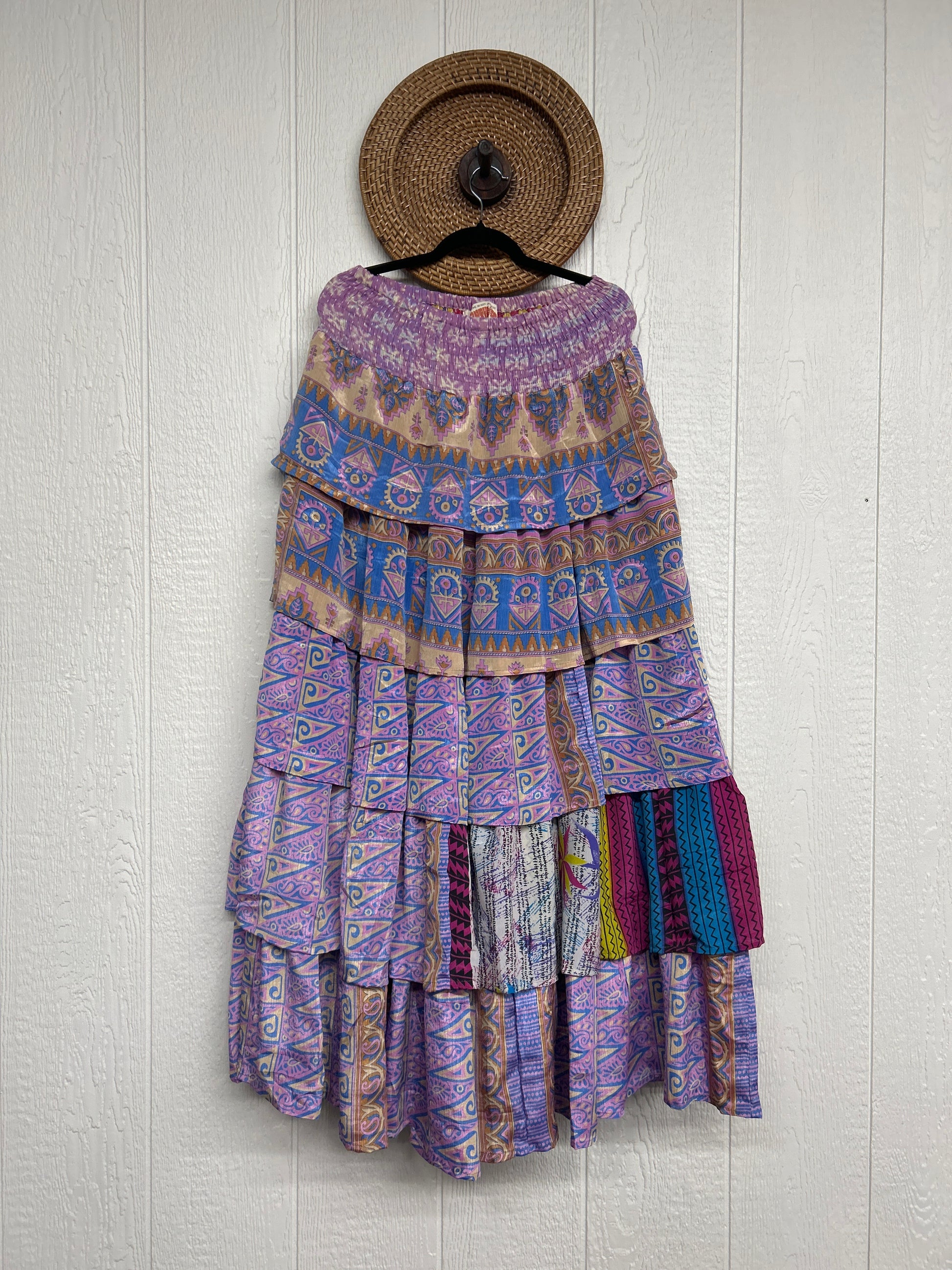 Crafted from vintage rasgulla sari, this ethereal piece features a stretchy ruffle waistband, a tiered floaty ruffle skirt.