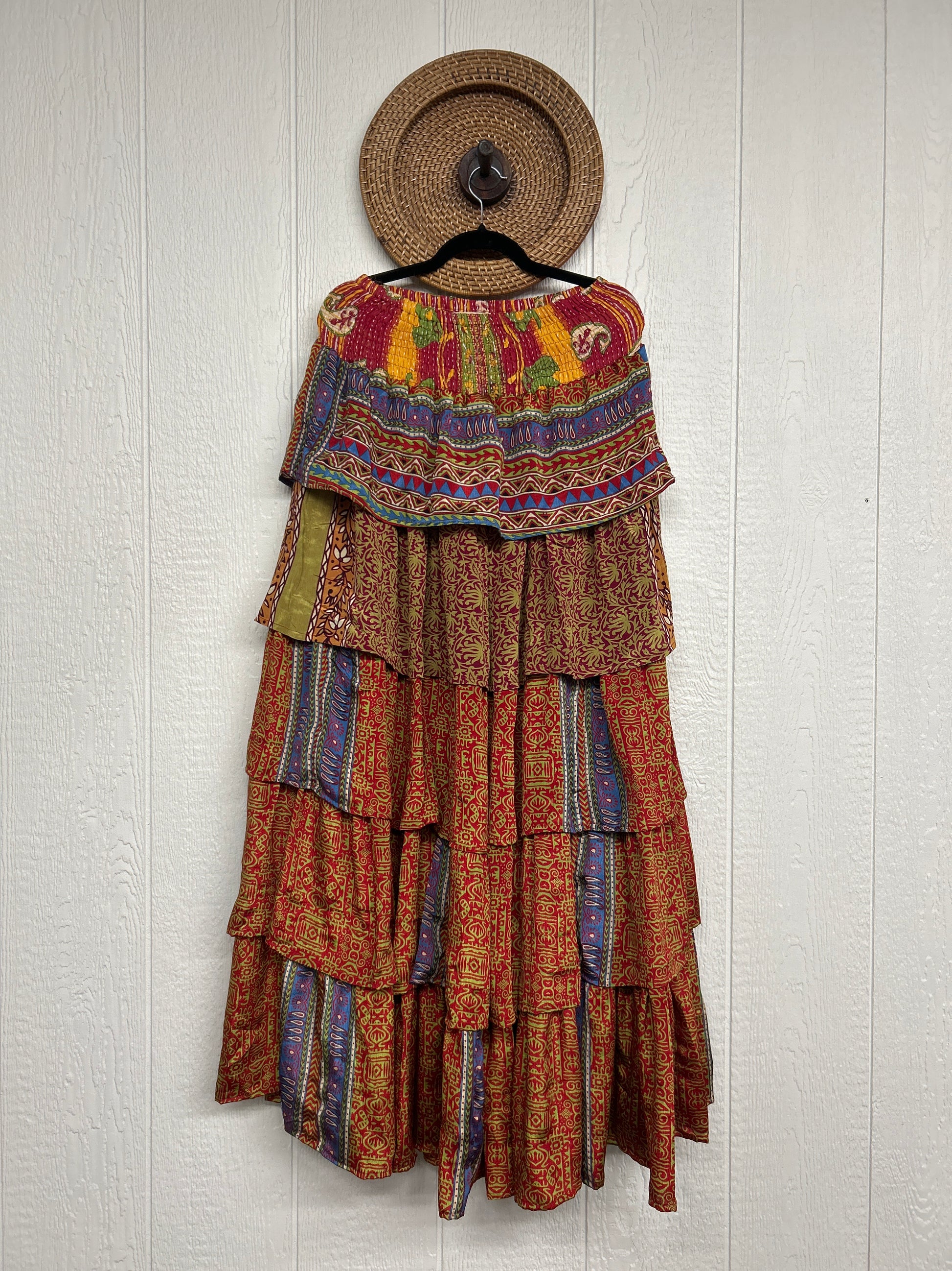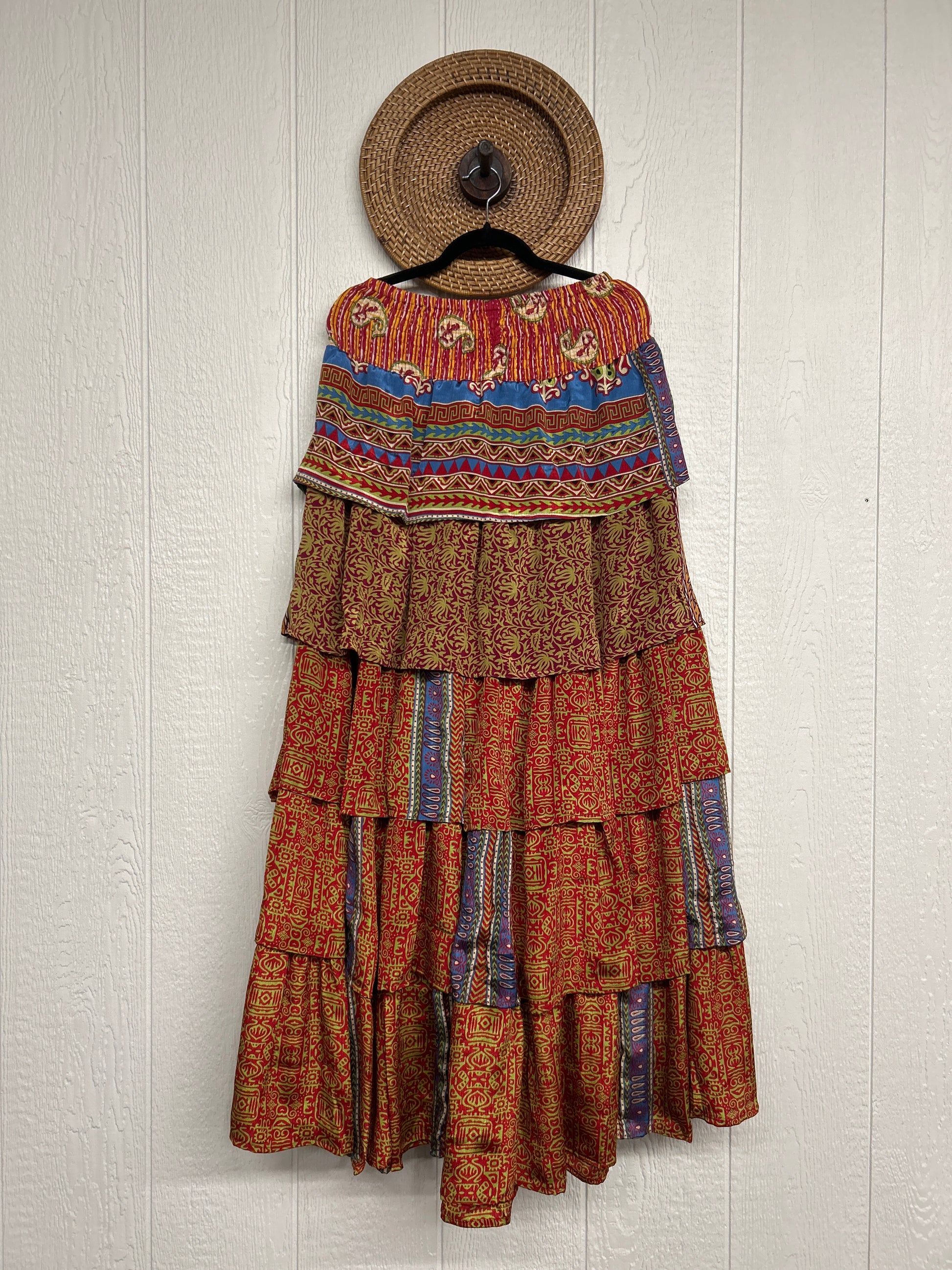 Crafted from vintage rasgulla sari, this ethereal piece features a stretchy ruffle waistband, a tiered floaty ruffle skirt.