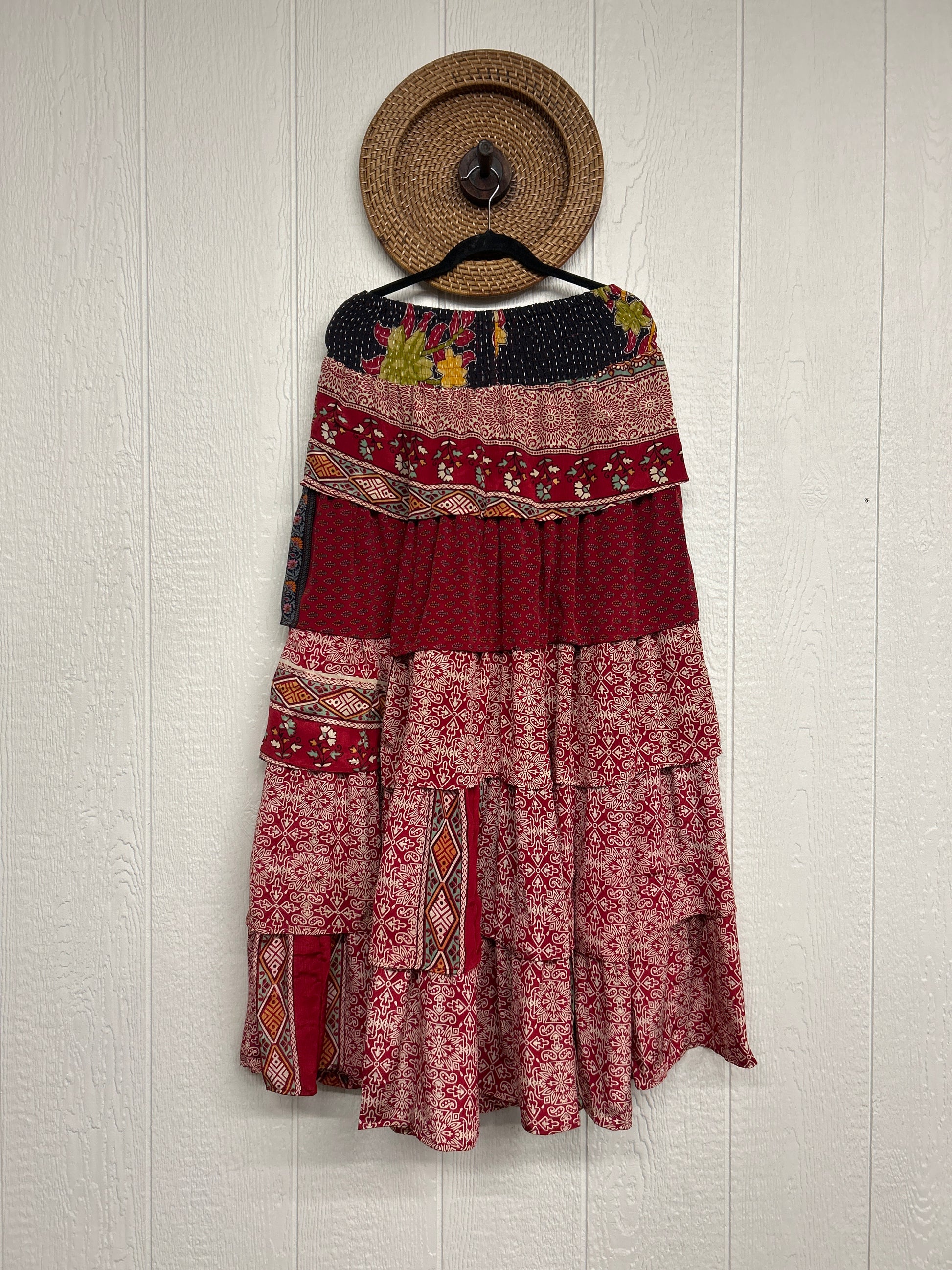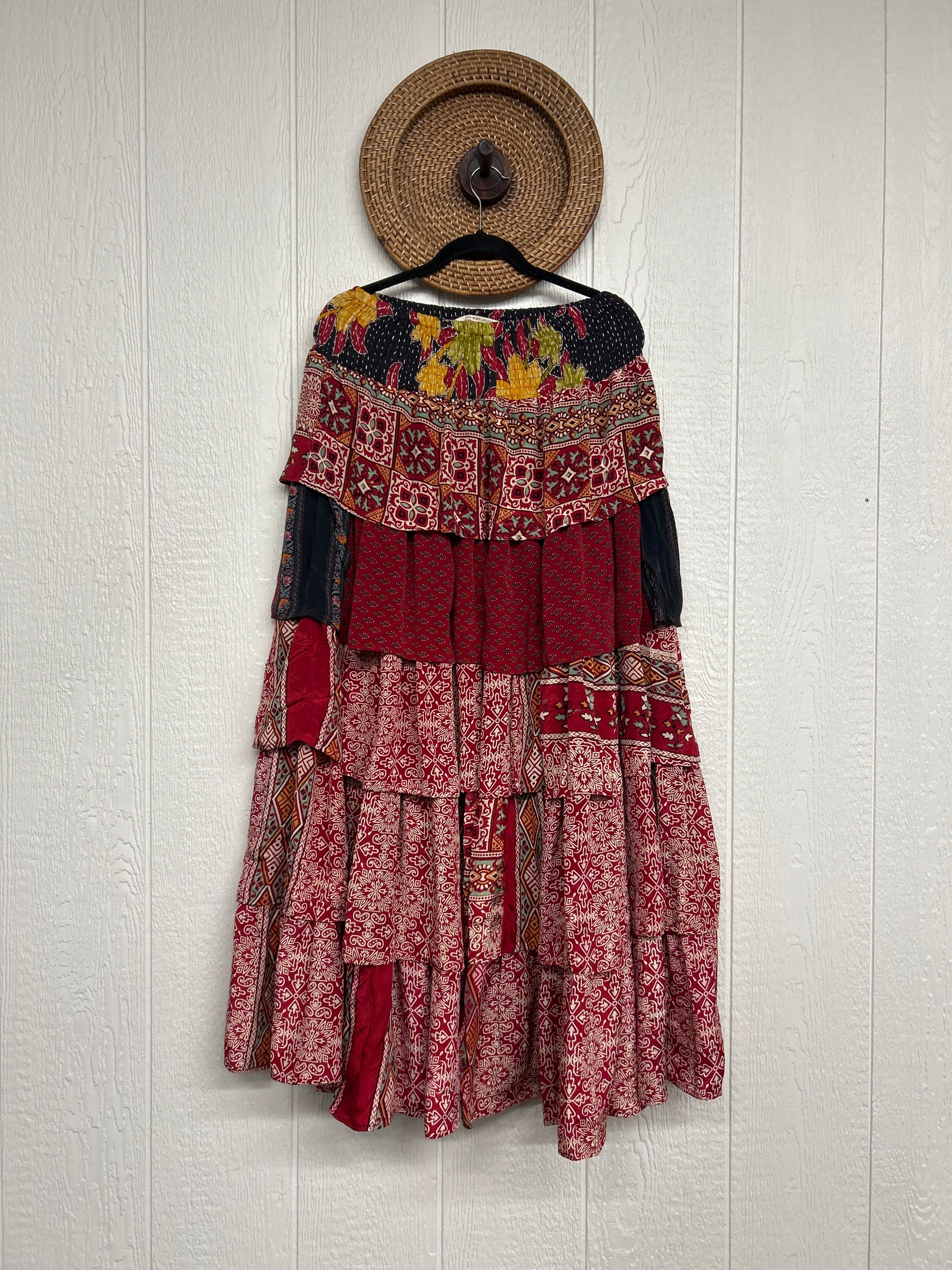 Crafted from vintage rasgulla sari, this ethereal piece features a stretchy ruffle waistband, a tiered floaty ruffle skirt.