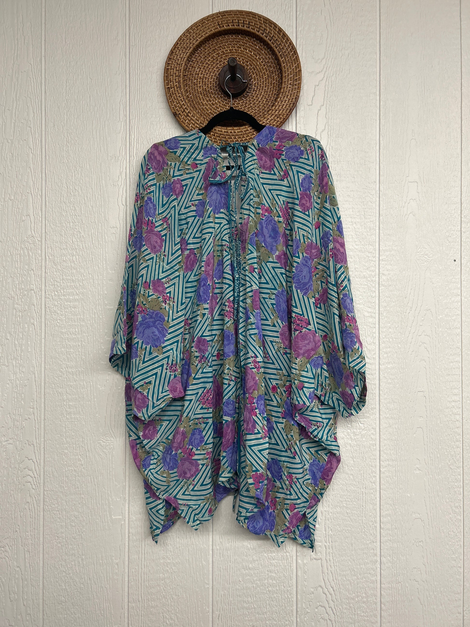 Fabrics may have small threads or holes in the layers. Color inconsistency or small stains may be present. The saris are sewn together and extend the life of each design. Imperfections should be celebrated.