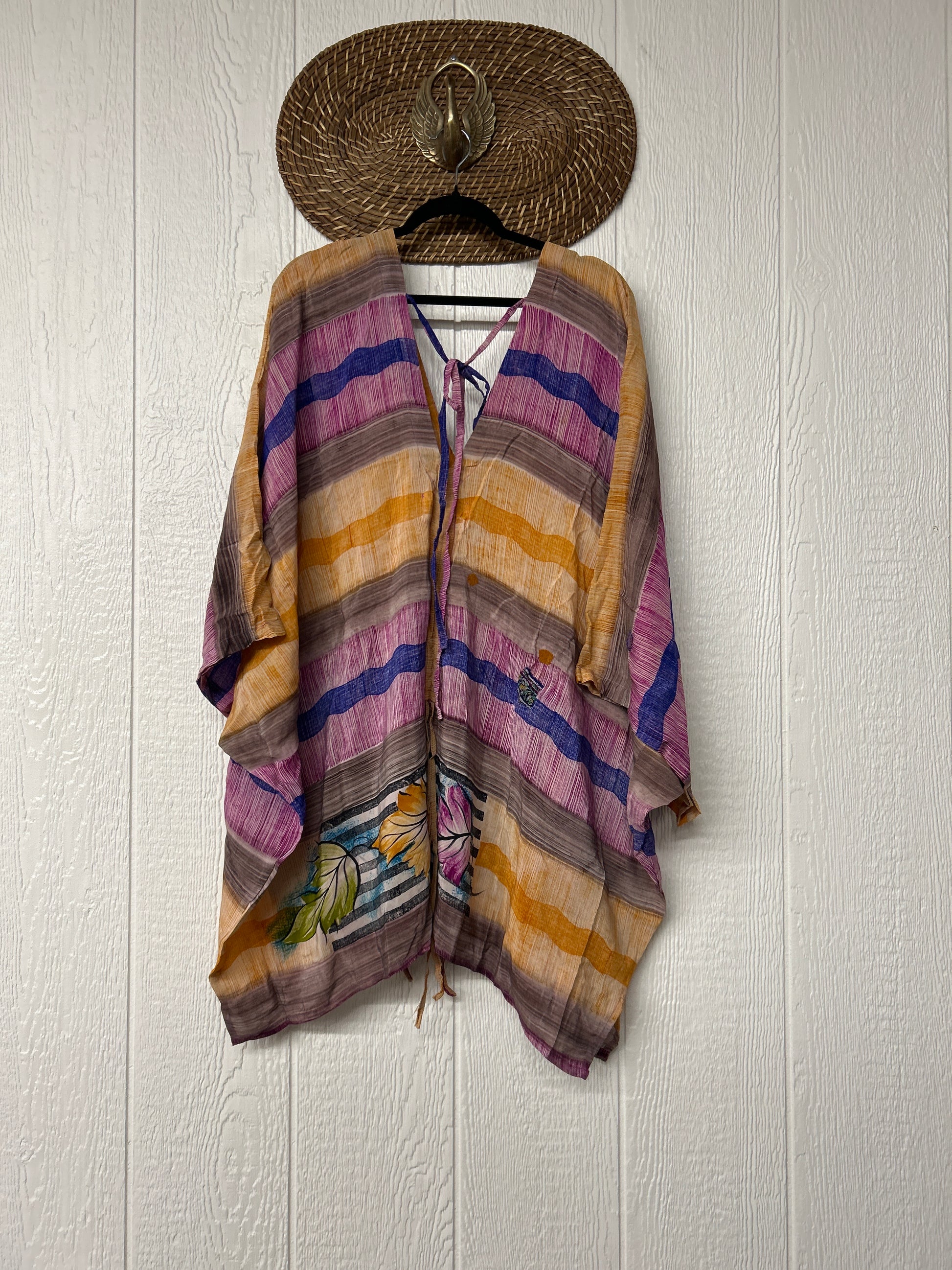 Fabrics may have small threads or holes in the layers. Color inconsistency or small stains may be present. The saris are sewn together and extend the life of each design. Imperfections should be celebrated.