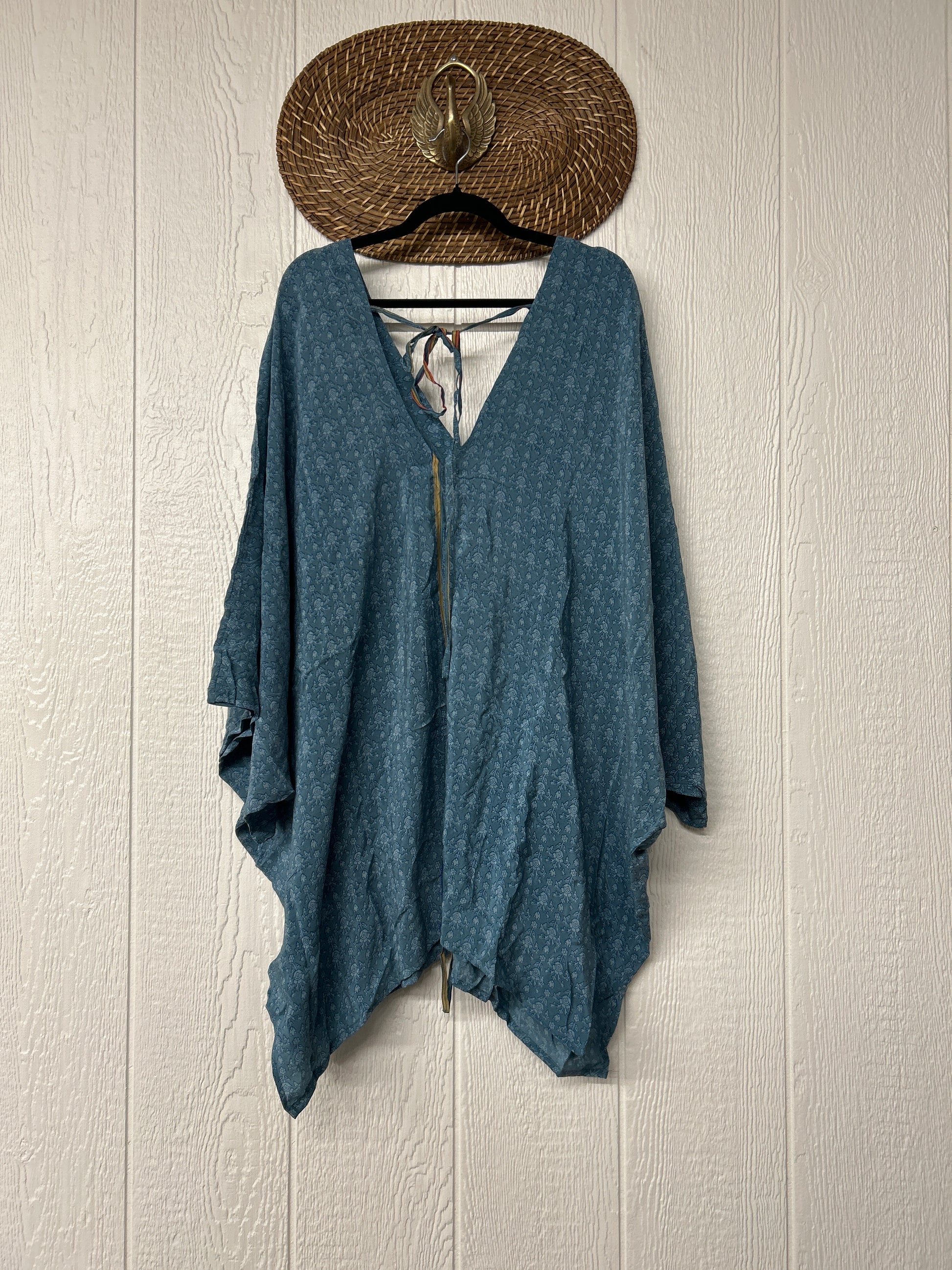 Fabrics may have small threads or holes in the layers. Color inconsistency or small stains may be present. The saris are sewn together and extend the life of each design. Imperfections should be celebrated.