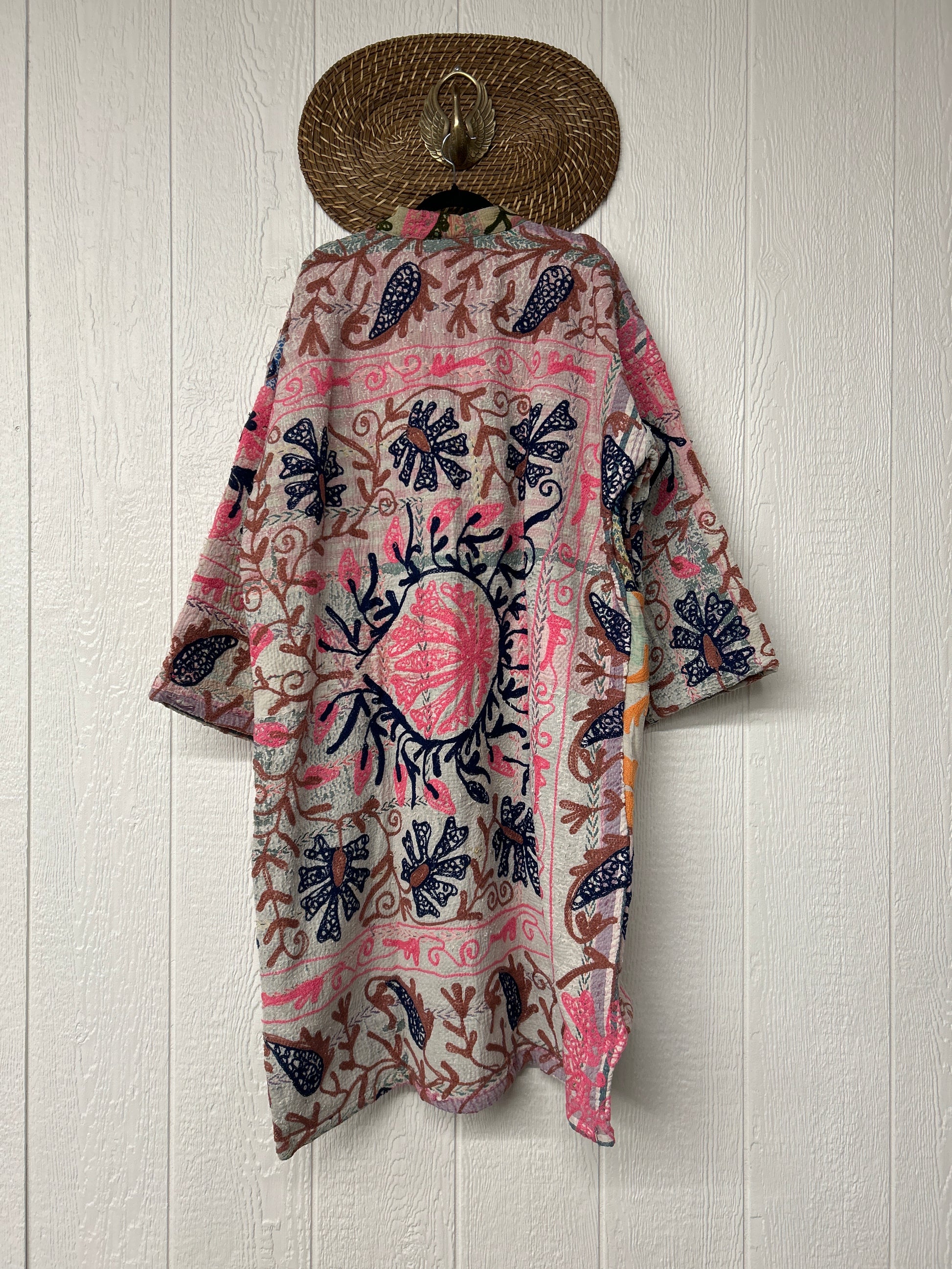 Crafted from hand embroidered fine kantha features slouchy exterior pockets, an open front silhouette with a slight high low hem for extra dimension.