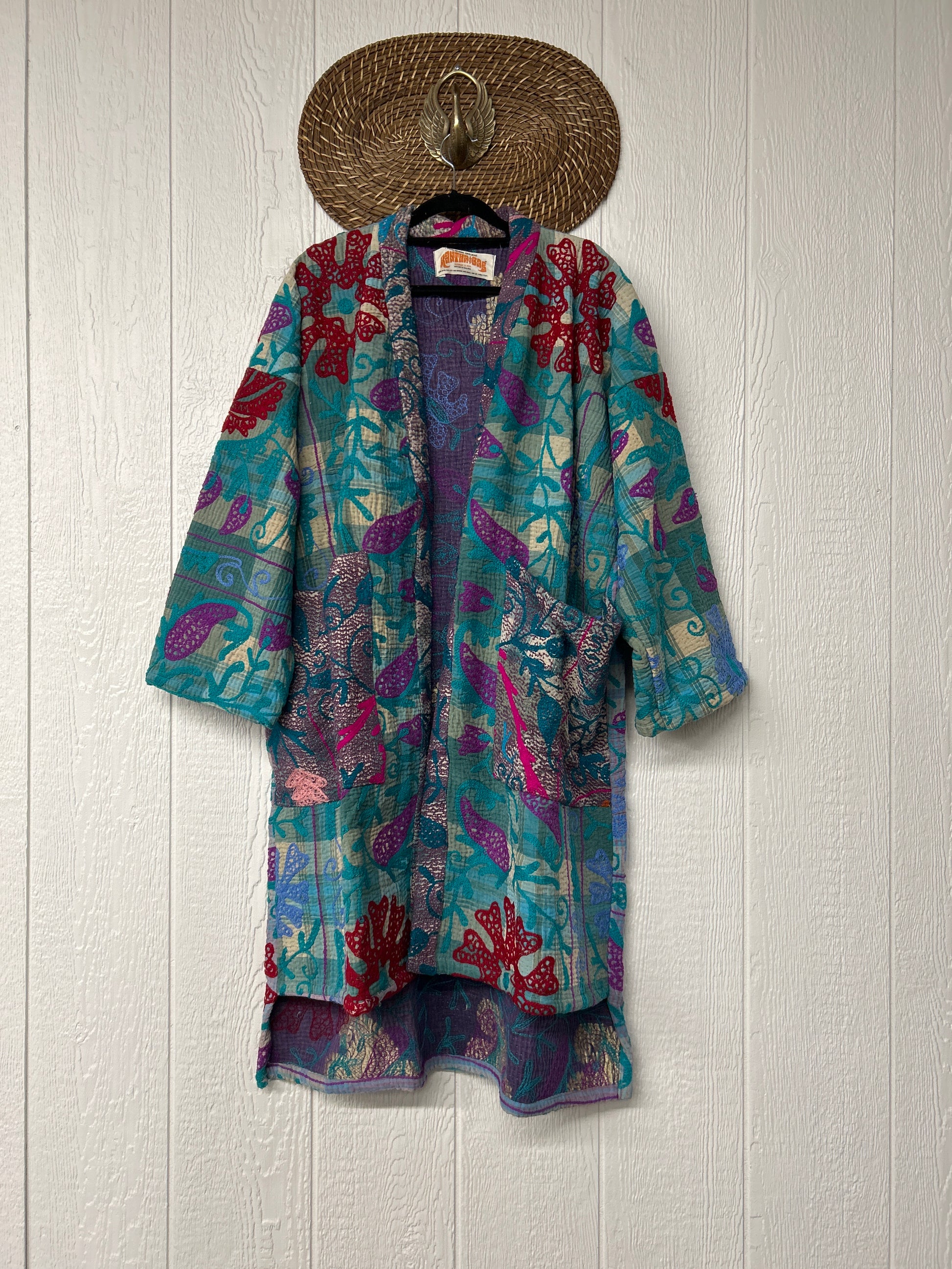 Crafted from hand embroidered fine kantha features slouchy exterior pockets, an open front silhouette with a slight high low hem for extra dimension.