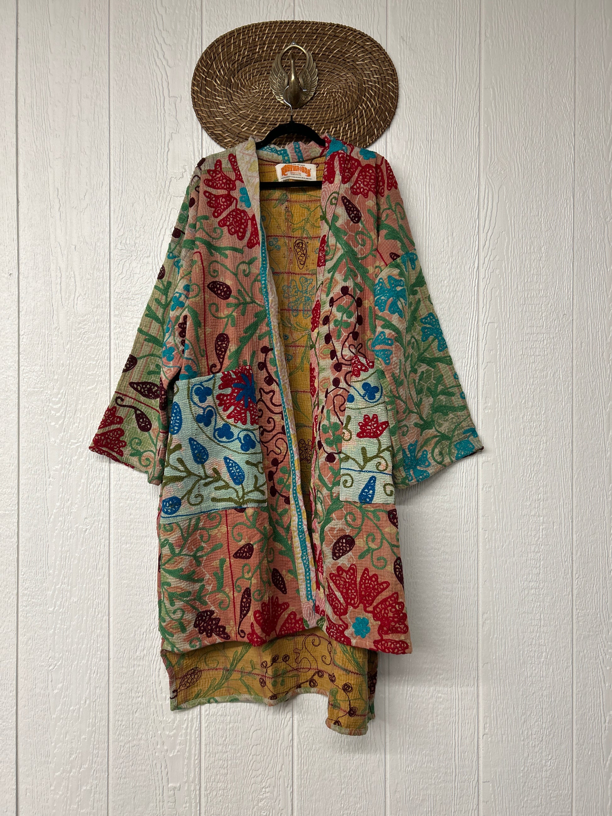 Crafted from hand embroidered fine kantha features slouchy exterior pockets, an open front silhouette with a slight high low hem for extra dimension.