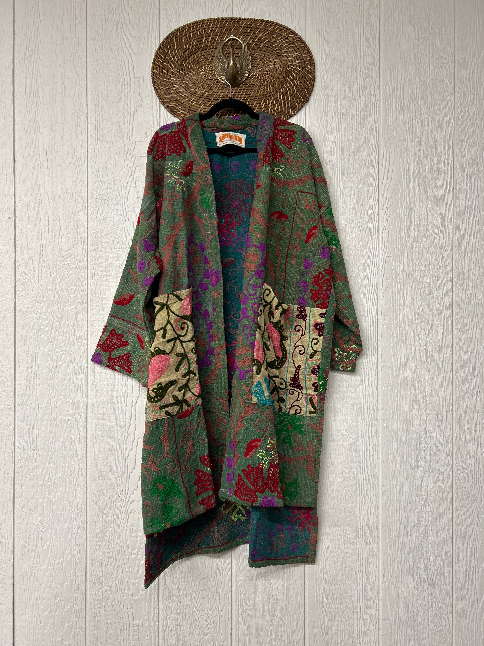 Crafted from hand embroidered fine kantha features slouchy exterior pockets, an open front silhouette with a slight high low hem for extra dimension.