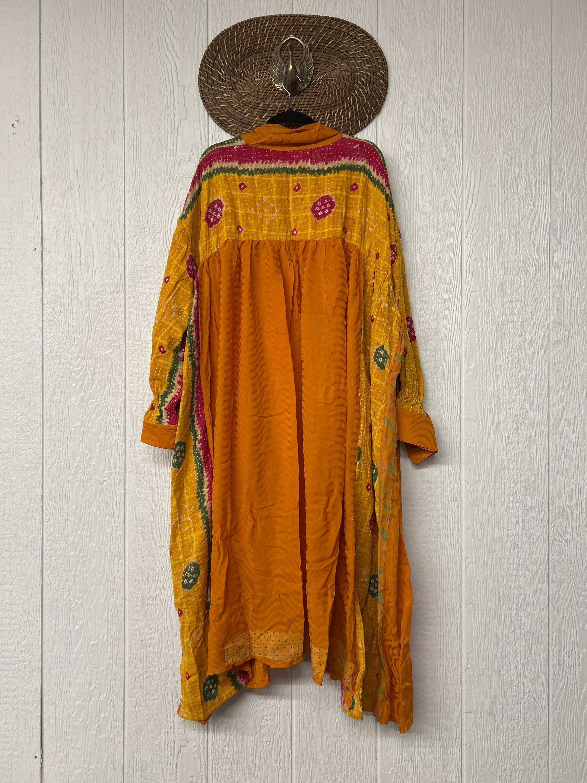This dream layering piece is made from a mix of our lux vintage kantha embroidered cotton and crepe sari. Features an elastic ruffle sleeve that is easy to pull up or down to your desired length.