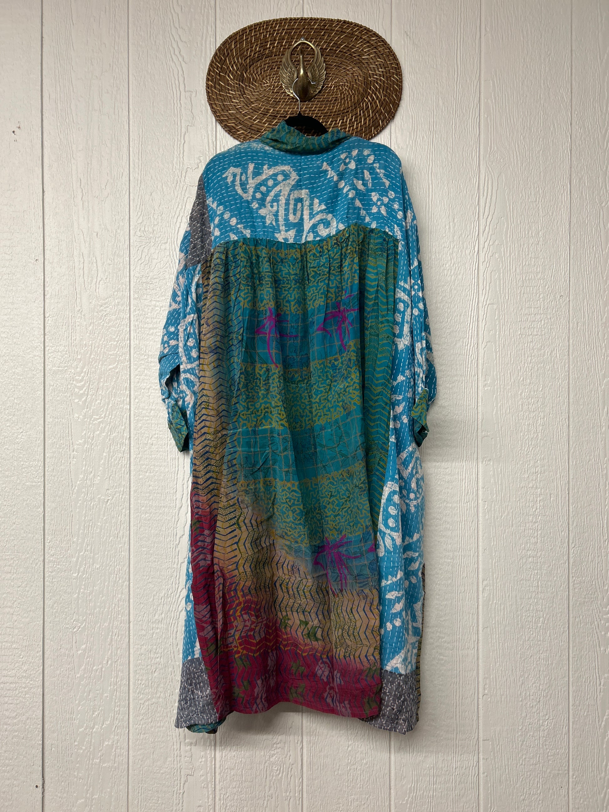 This dream layering piece is made from a mix of our lux vintage kantha embroidered cotton and crepe sari. Features an elastic ruffle sleeve that is easy to pull up or down to your desired length.