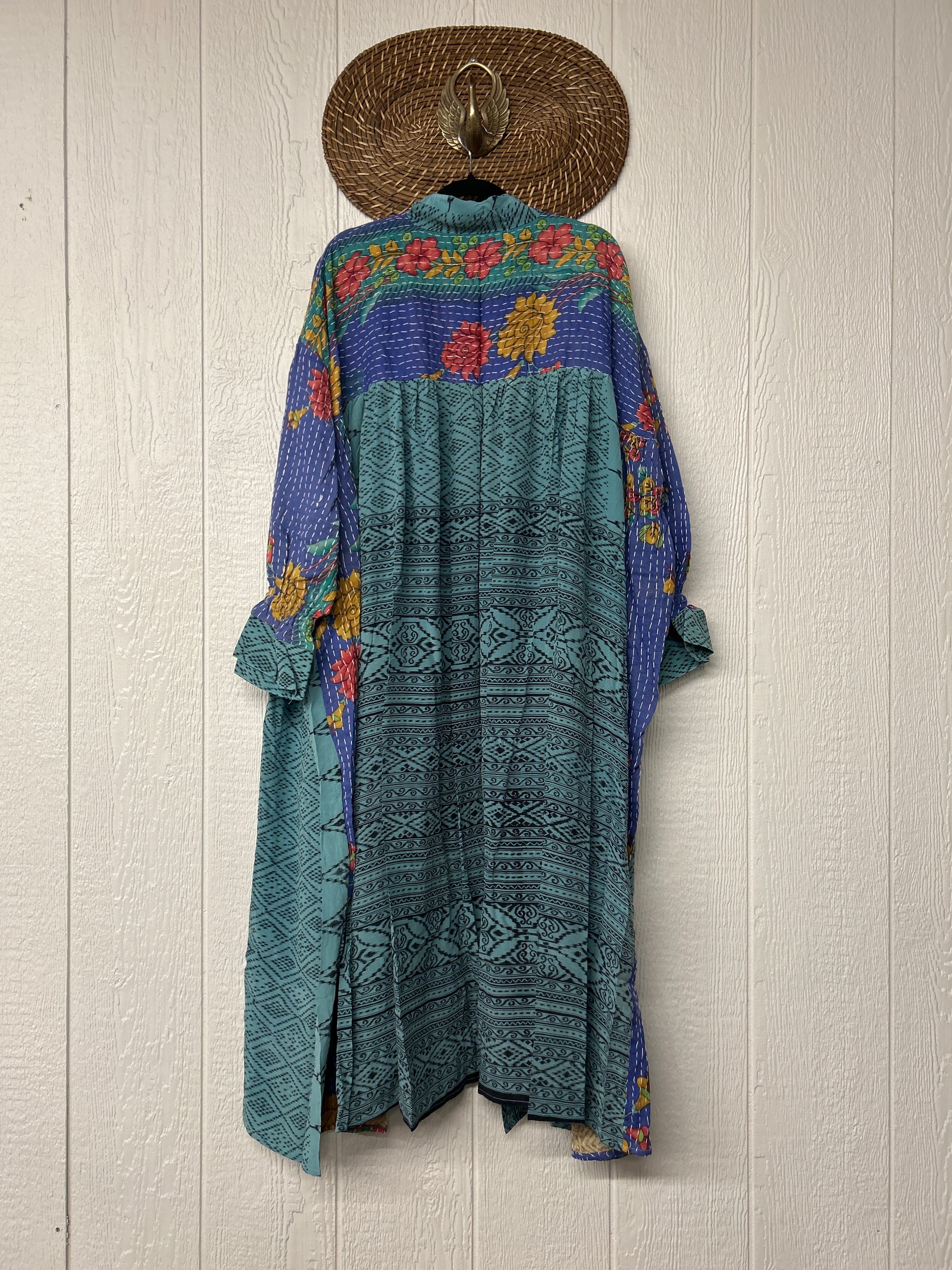 This dream layering piece is made from a mix of our lux vintage kantha embroidered cotton and crepe sari. Features an elastic ruffle sleeve that is easy to pull up or down to your desired length.