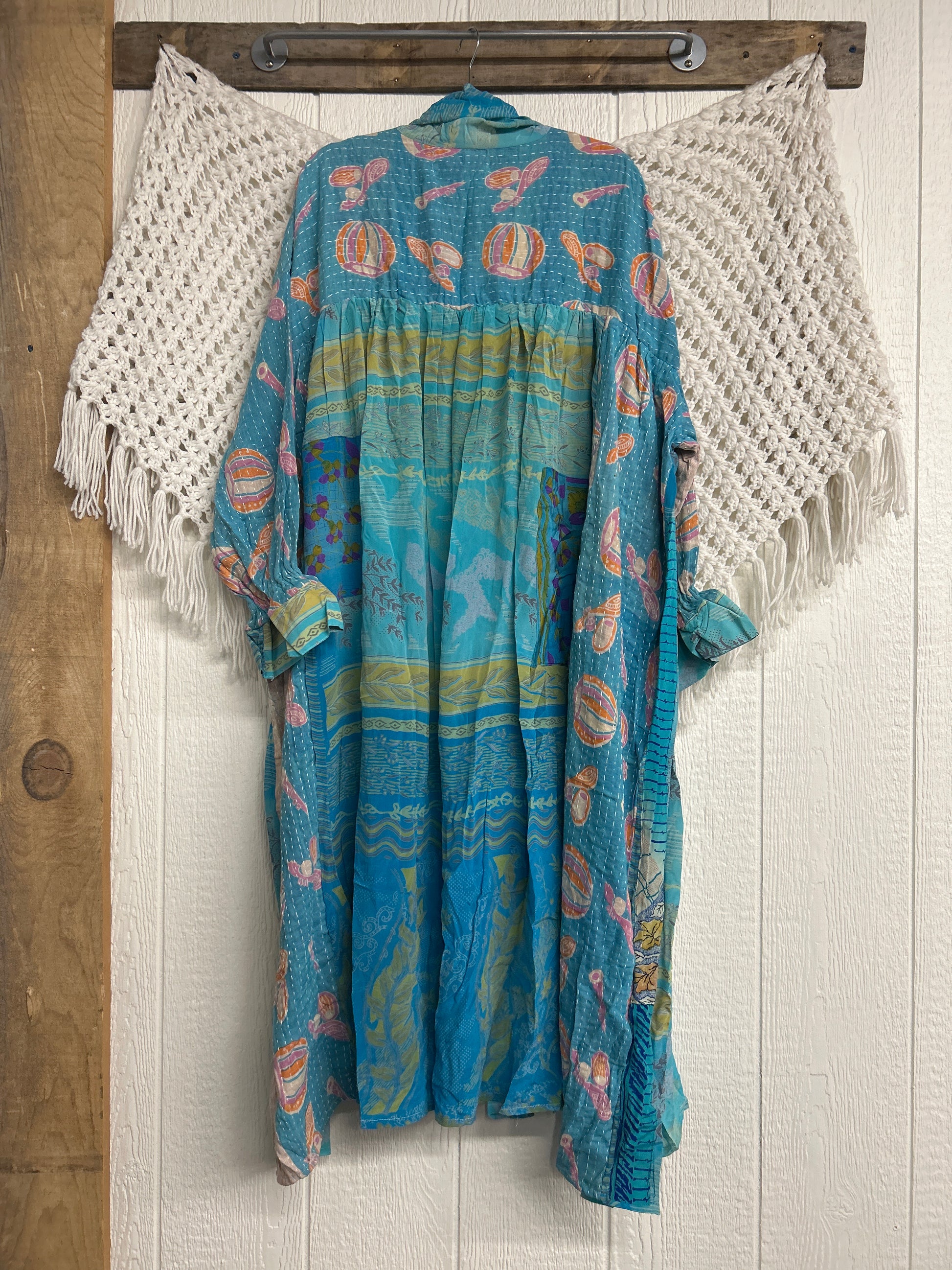 This dream layering piece is made from a mix of our lux vintage kantha embroidered cotton and crepe sari. Features an elastic ruffle sleeve that is easy to pull up or down to your desired length.