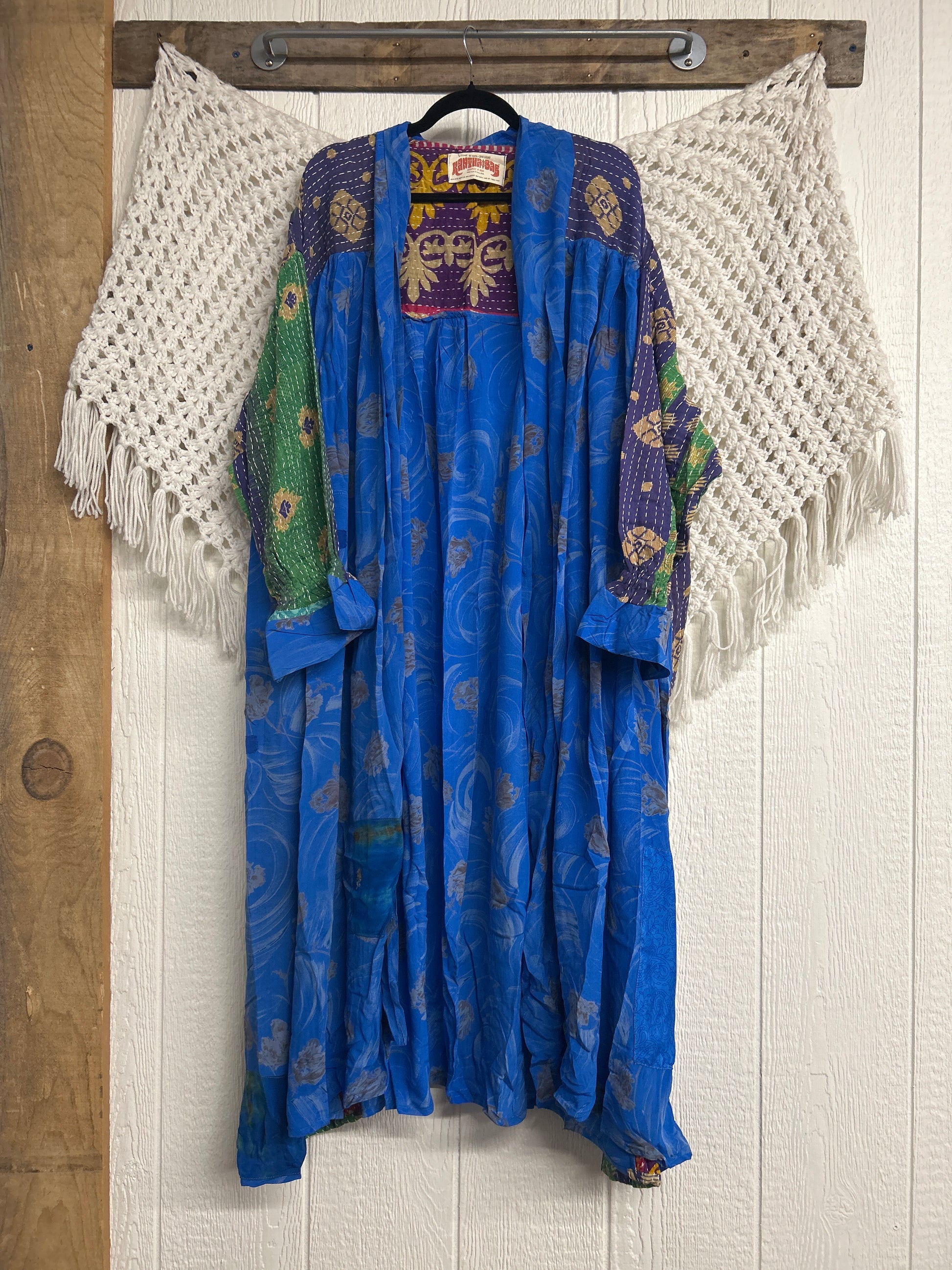 This dream layering piece is made from a mix of our lux vintage kantha embroidered cotton and crepe sari. Features an elastic ruffle sleeve that is easy to pull up or down to your desired length.