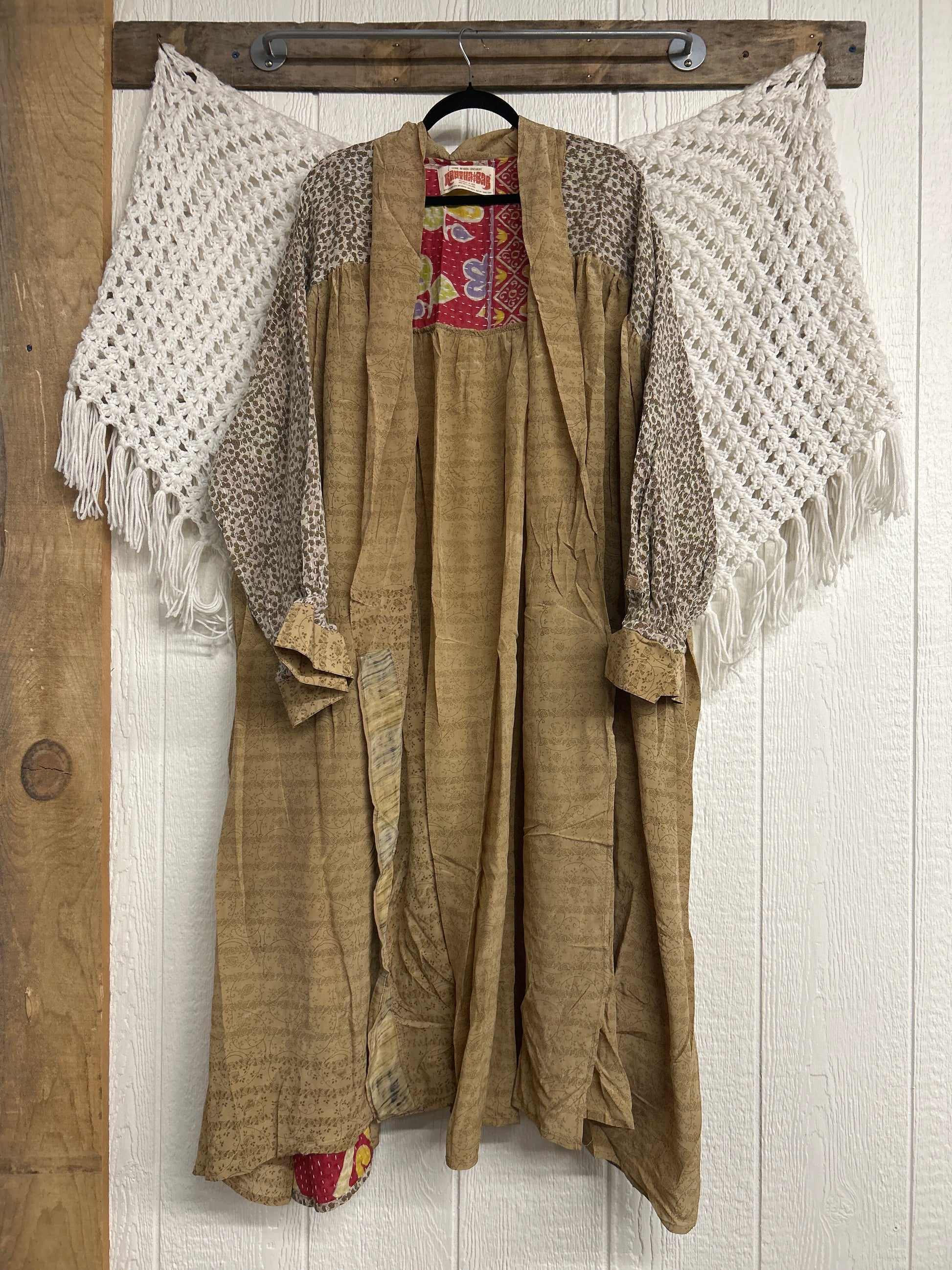 This dream layering piece is made from a mix of our lux vintage kantha embroidered cotton and crepe sari. Features an elastic ruffle sleeve that is easy to pull up or down to your desired length.