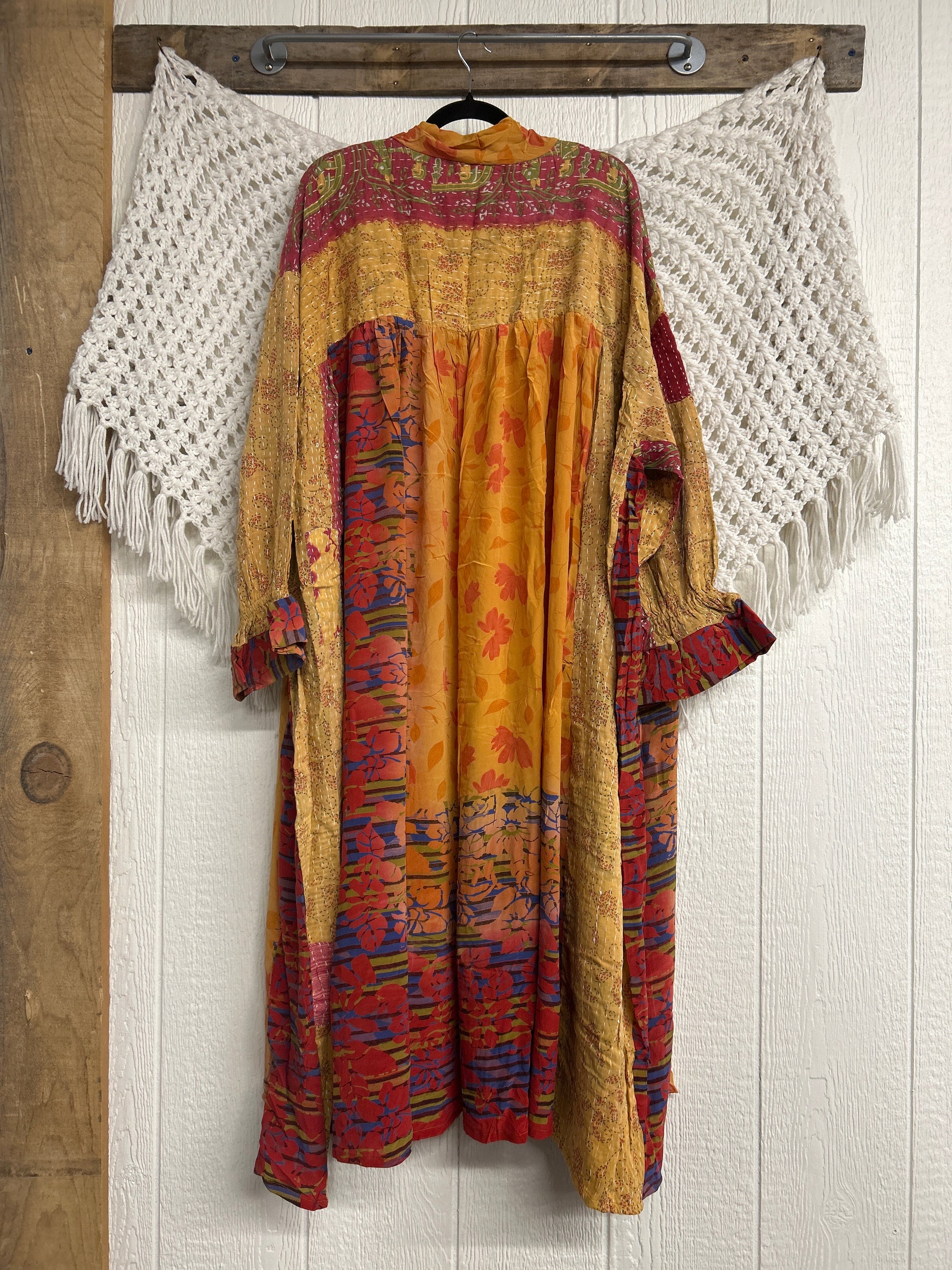 This dream layering piece is made from a mix of our lux vintage kantha embroidered cotton and crepe sari. Features an elastic ruffle sleeve that is easy to pull up or down to your desired length.