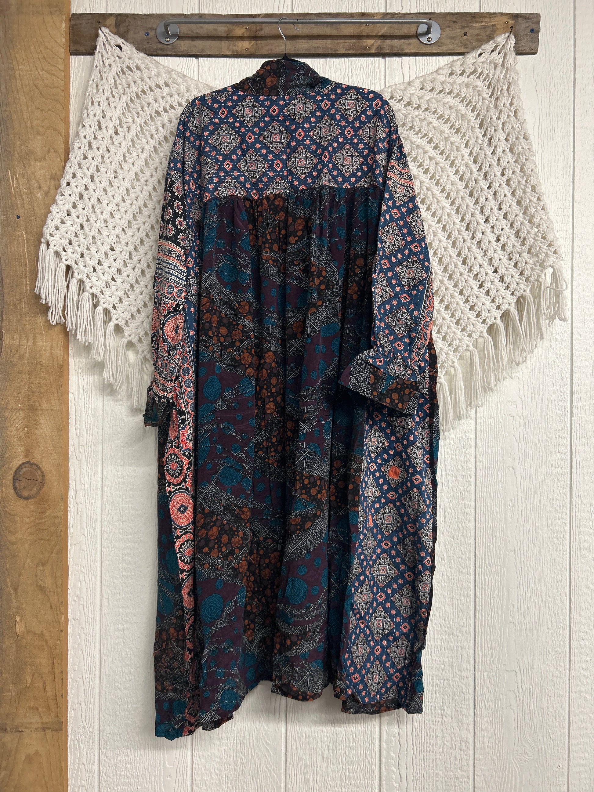 This dream layering piece is made from a mix of our lux vintage kantha embroidered cotton and crepe sari. Features an elastic ruffle sleeve that is easy to pull up or down to your desired length.