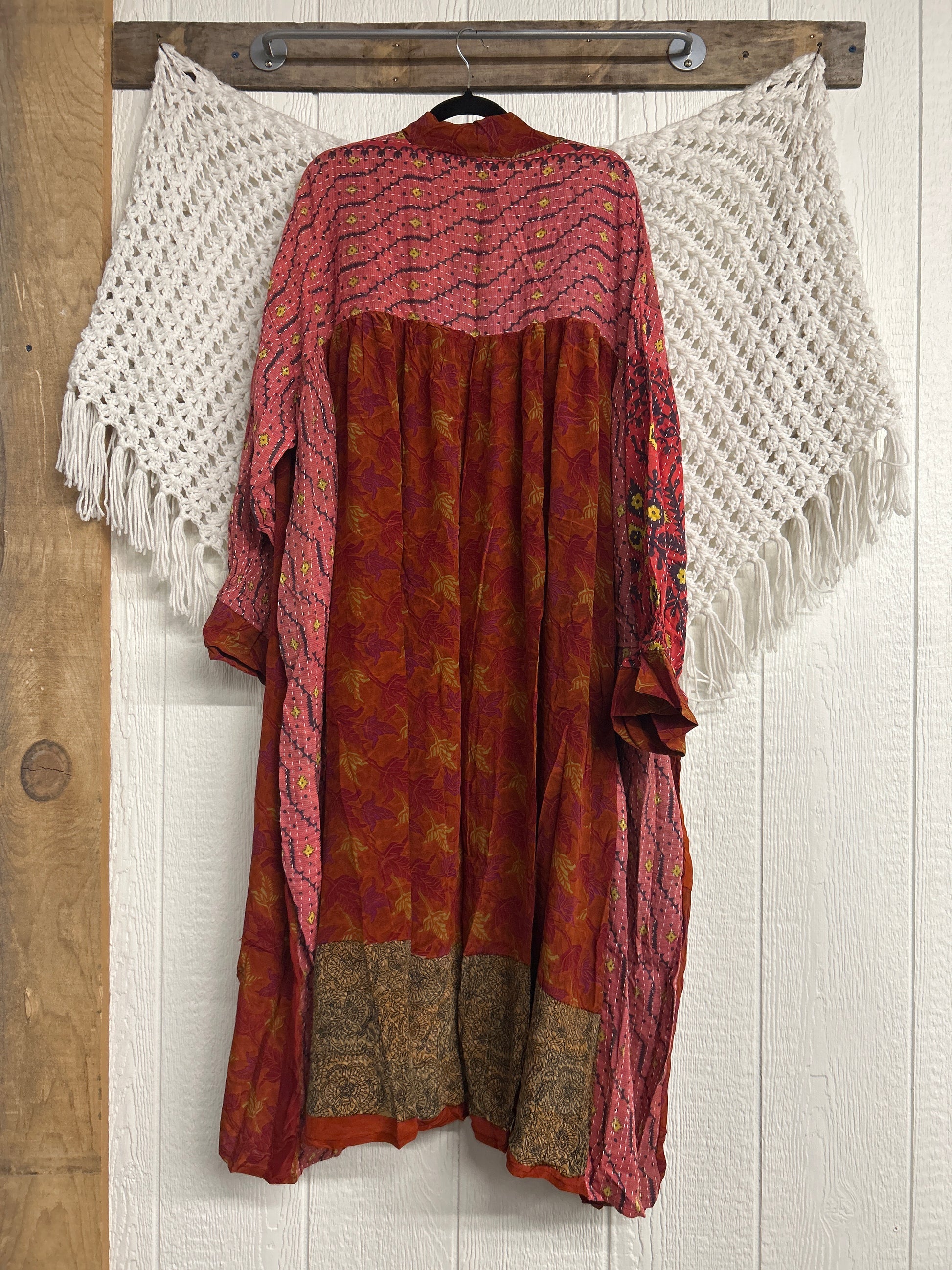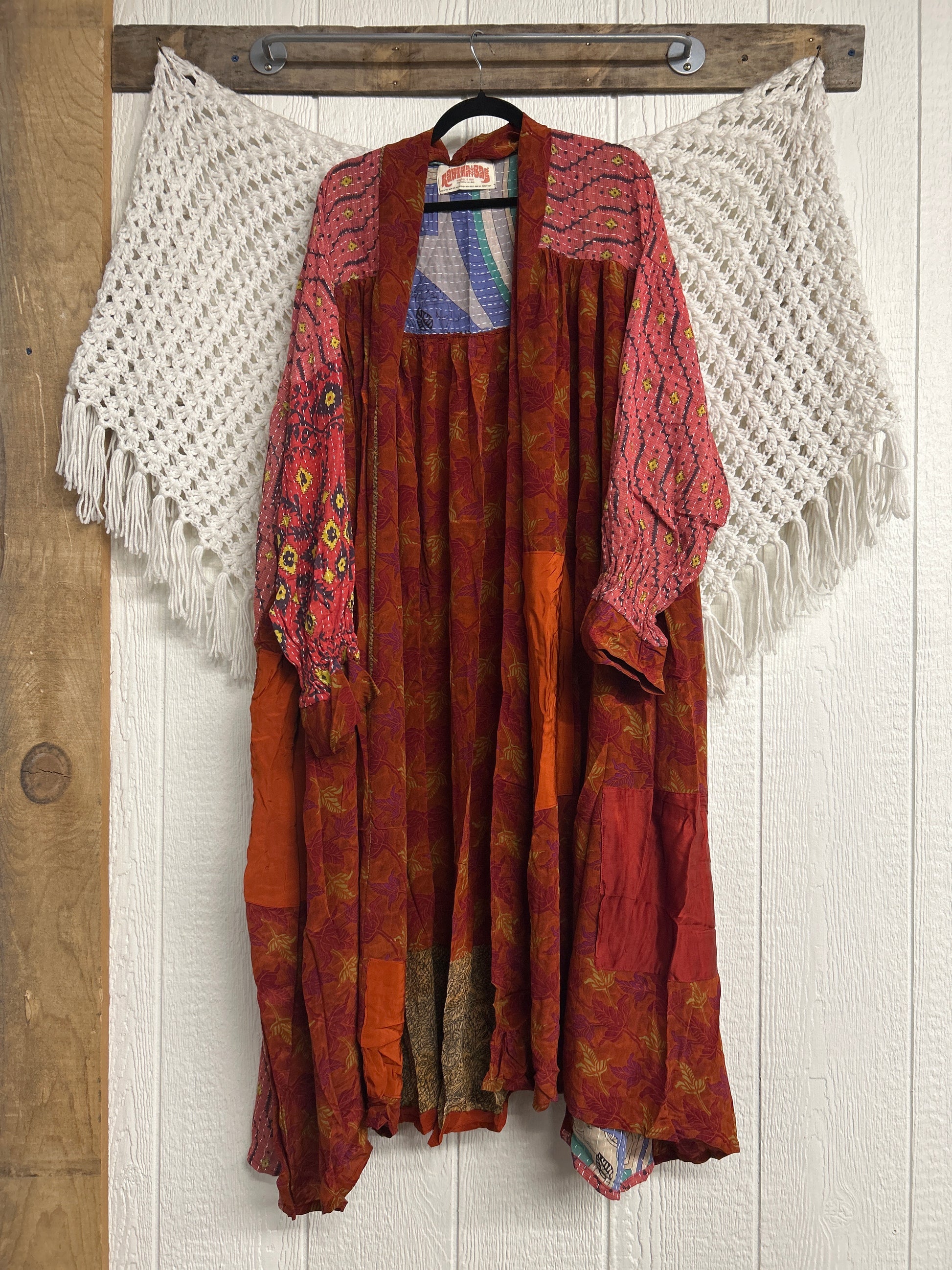 This dream layering piece is made from a mix of our lux vintage kantha embroidered cotton and crepe sari. Features an elastic ruffle sleeve that is easy to pull up or down to your desired length.