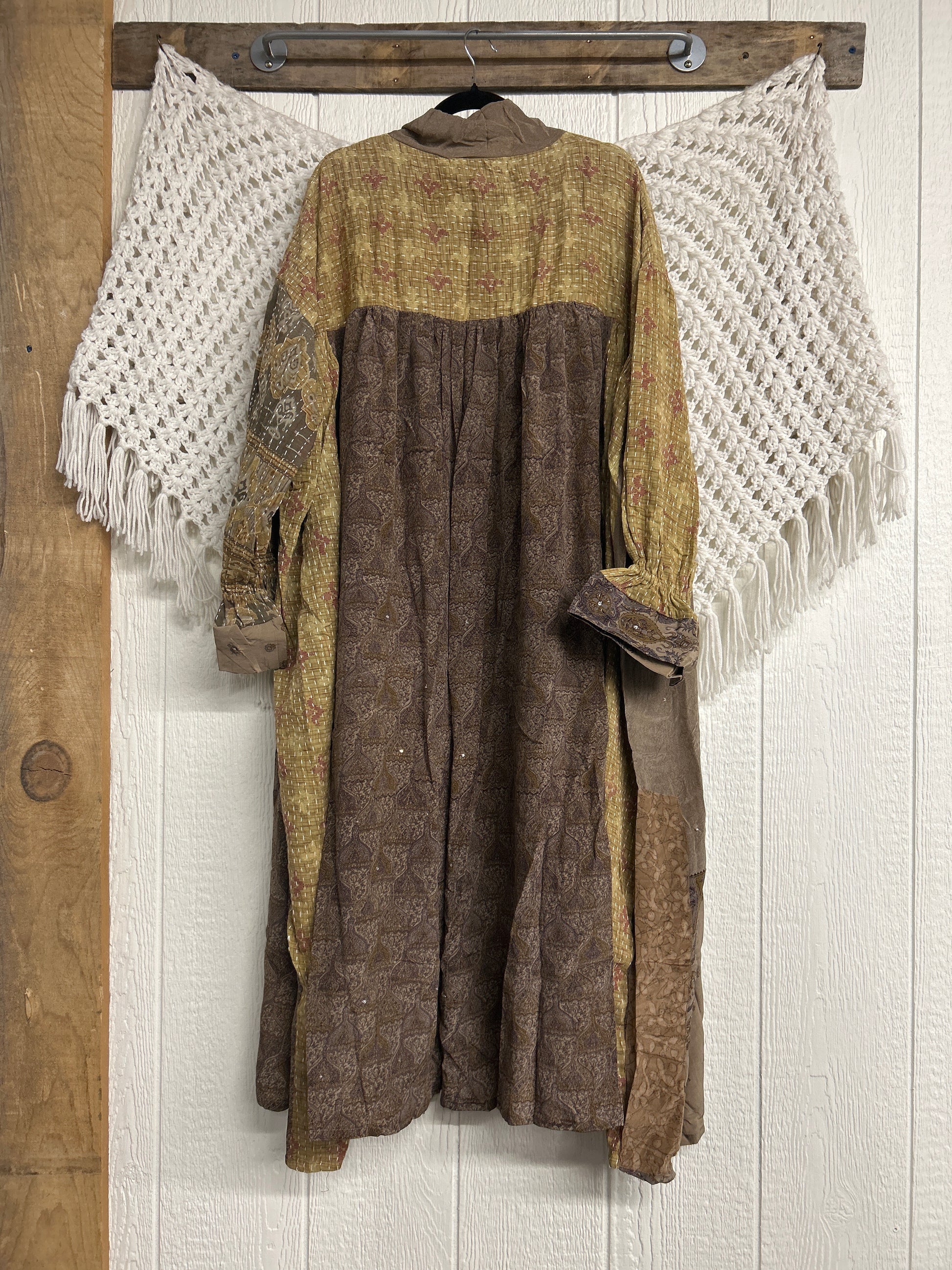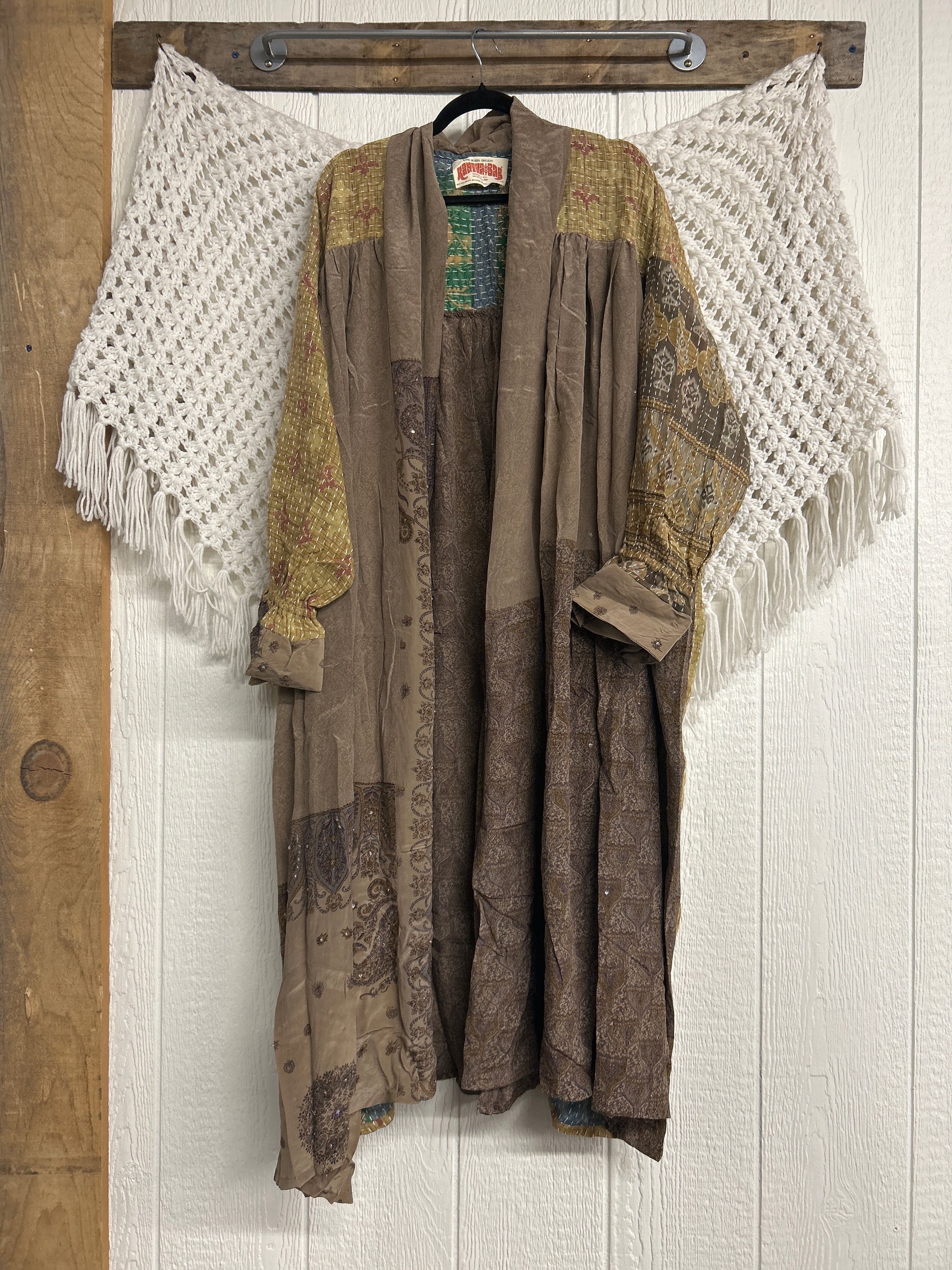 This dream layering piece is made from a mix of our lux vintage kantha embroidered cotton and crepe sari. Features an elastic ruffle sleeve that is easy to pull up or down to your desired length.