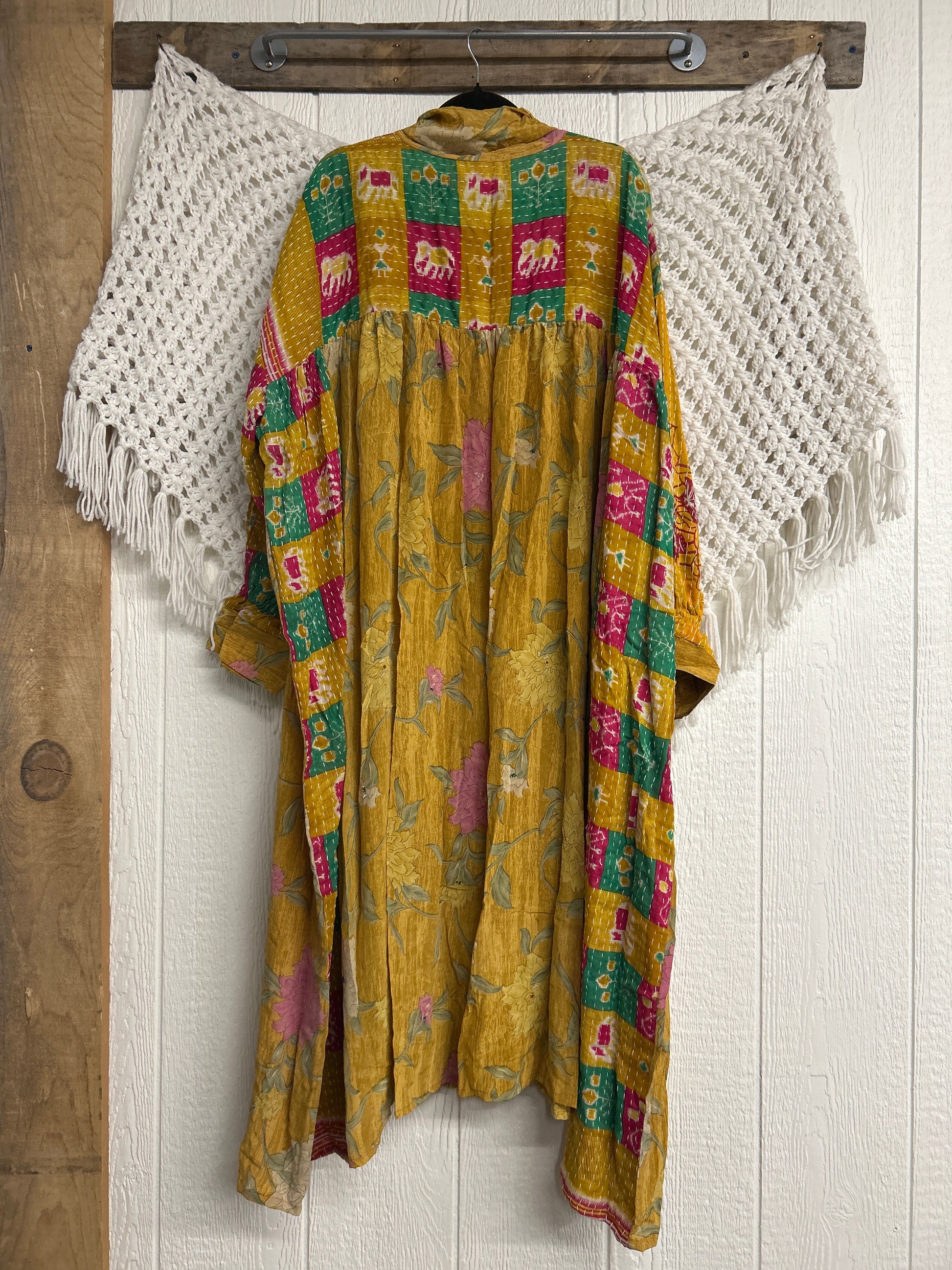 This dream layering piece is made from a mix of our lux vintage kantha embroidered cotton and crepe sari. Features an elastic ruffle sleeve that is easy to pull up or down to your desired length.