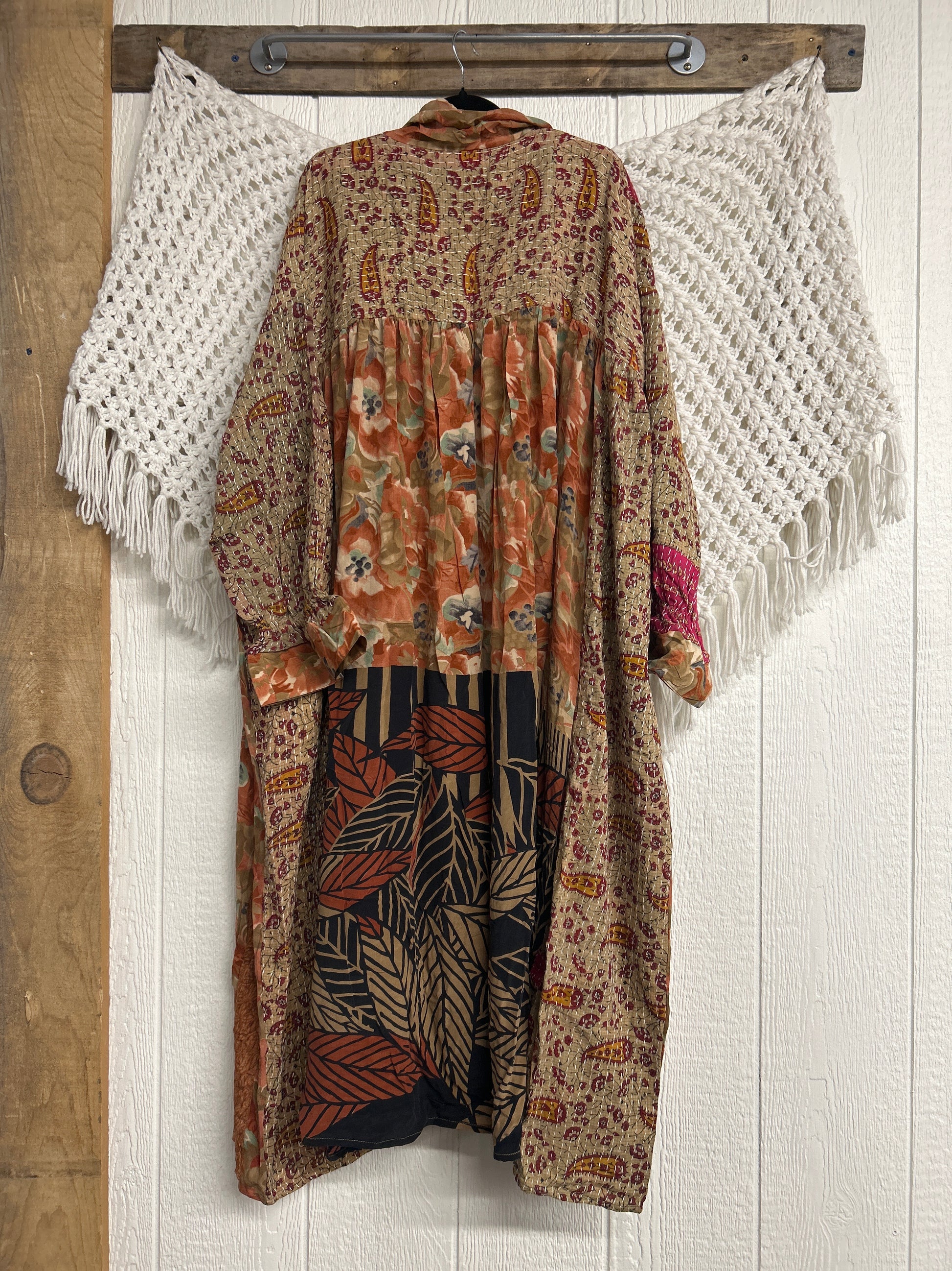 This dream layering piece is made from a mix of our lux vintage kantha embroidered cotton and crepe sari. Features an elastic ruffle sleeve that is easy to pull up or down to your desired length.