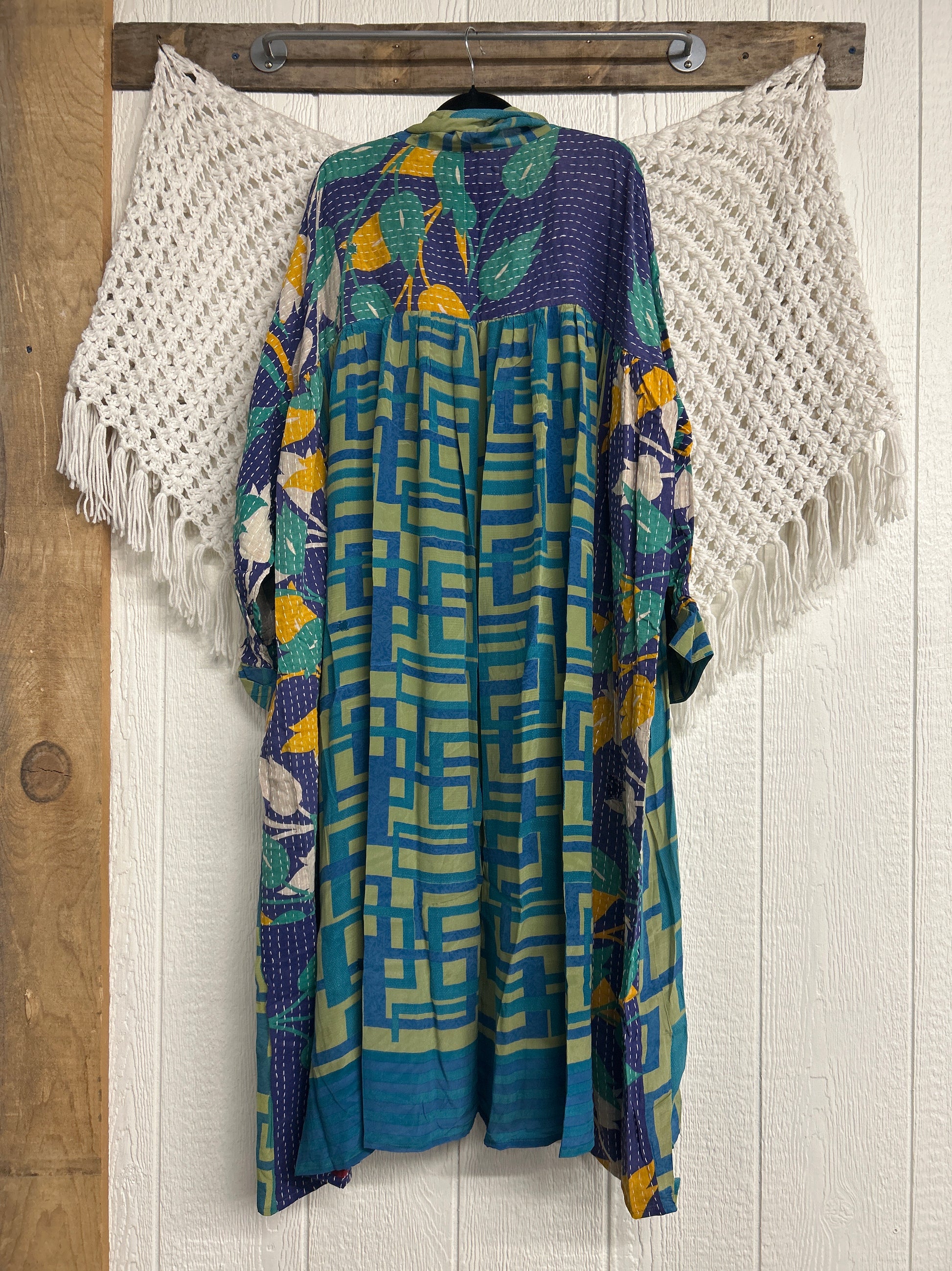 Crafted and sewn by families in a small village in Northern India providing work and a fair living. This product should be hand washed and line dried for longest life. For softness, fluff in the dryer on low heat after it has dried from hand washing. Disclosure: Our vintage styles have lived a full life before becoming the designs in our shop. Fabrics may have small threads or holes in the layers. Color inconsistency or small stains may be present. The saris are sewn together and extend the life of each design. Imperfections should be celebrated.