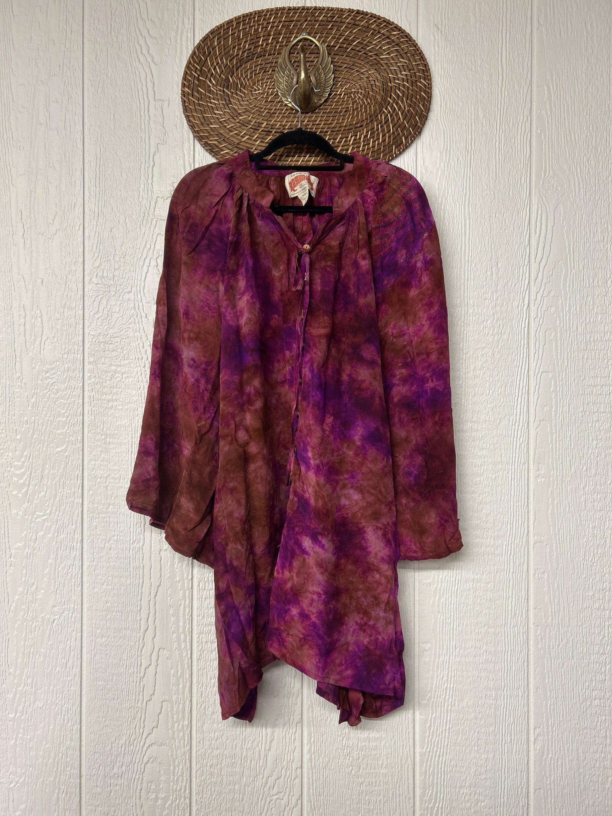 This floaty wonder is made from our ultra lux vintage crepe sari. Our India team has hand tie dyed these unique pieces in the dreamiest colors. The Woodstock Shortie Kimono can be buttoned up as a dress or worn open as the vibiest kimono. Wide bell sleeves make this statement piece the ultimate vibe!