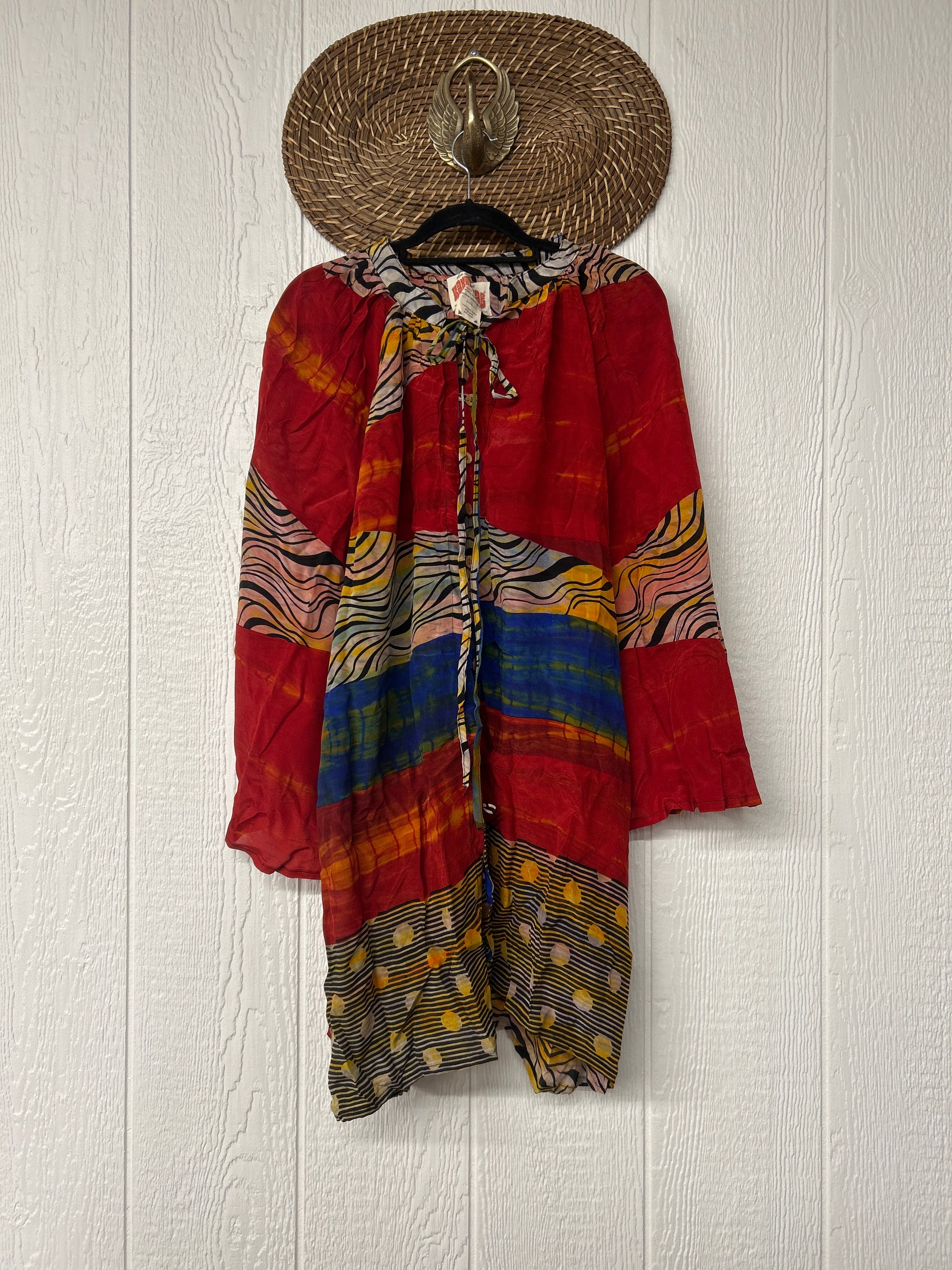 This floaty wonder is made from our ultra lux vintage crepe sari. Our India team has hand tie dyed these unique pieces in the dreamiest colors. The Woodstock Shortie Kimono can be buttoned up as a dress or worn open as the vibiest kimono. Wide bell sleeves make this statement piece the ultimate vibe!