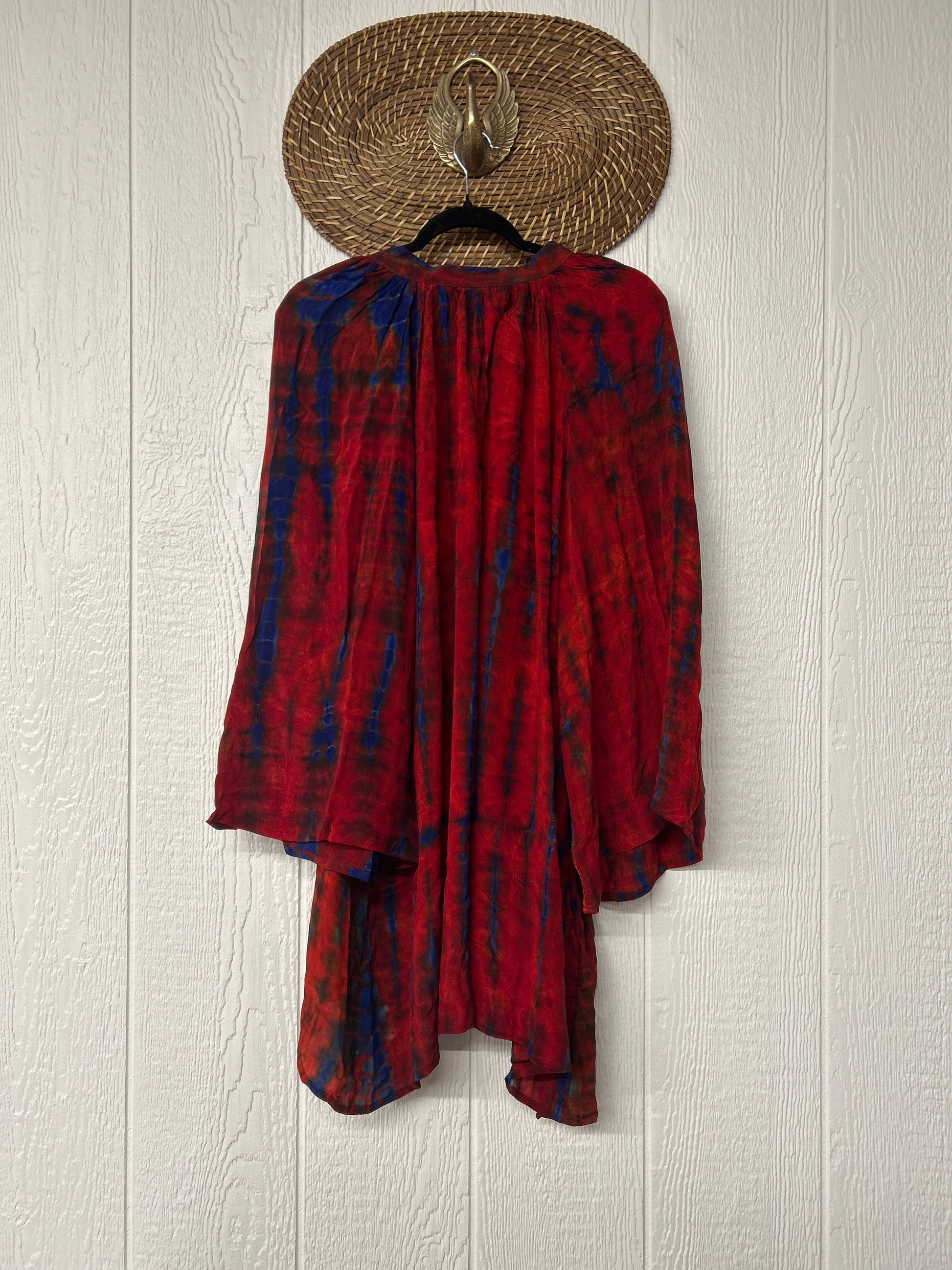This floaty wonder is made from our ultra lux vintage crepe sari. Our India team has hand tie dyed these unique pieces in the dreamiest colors. The Woodstock Shortie Kimono can be buttoned up as a dress or worn open as the vibiest kimono. Wide bell sleeves make this statement piece the ultimate vibe!