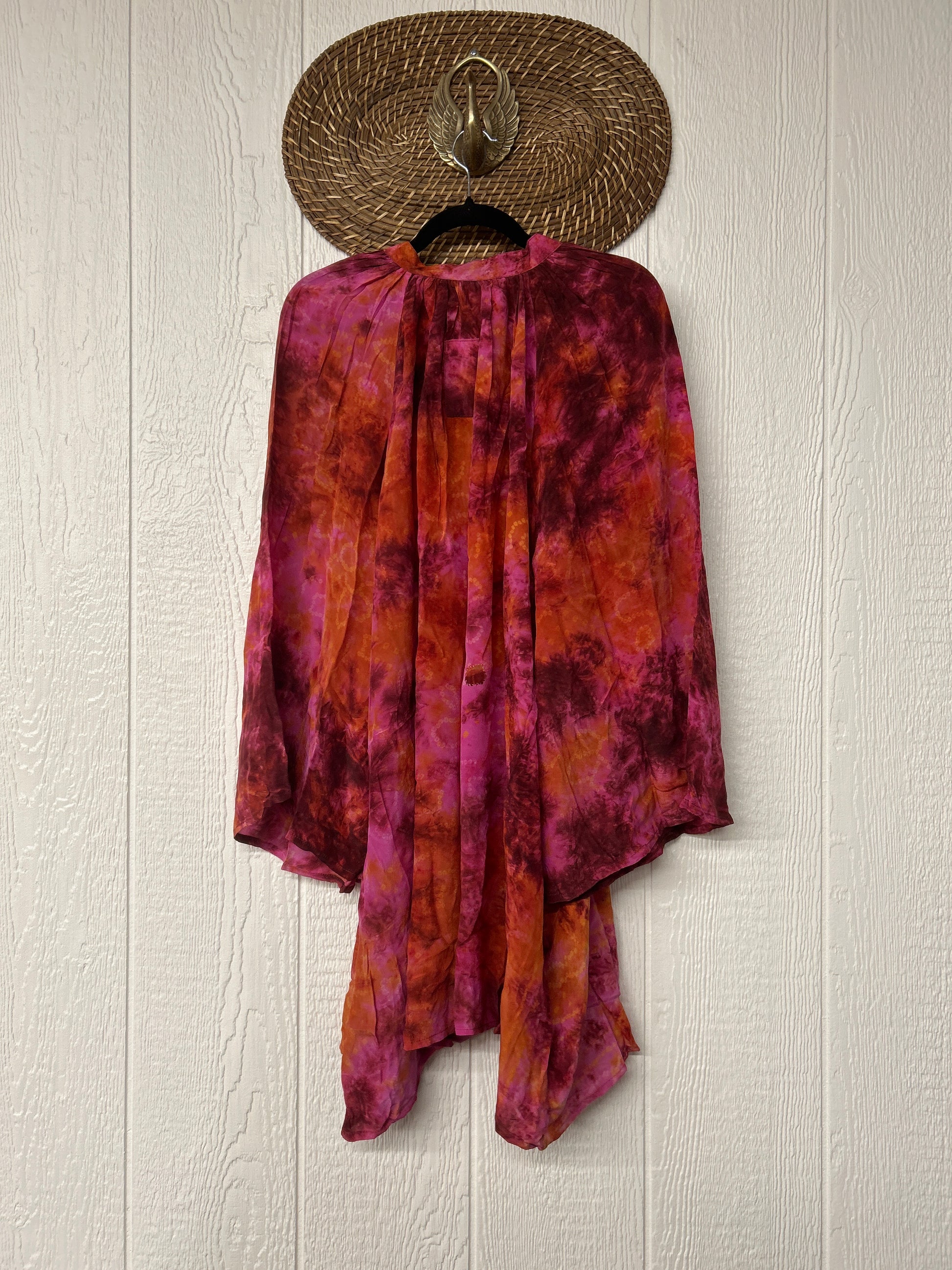 This floaty wonder is made from our ultra lux vintage crepe sari. Our India team has hand tie dyed these unique pieces in the dreamiest colors. The Woodstock Shortie Kimono can be buttoned up as a dress or worn open as the vibiest kimono. Wide bell sleeves make this statement piece the ultimate vibe!