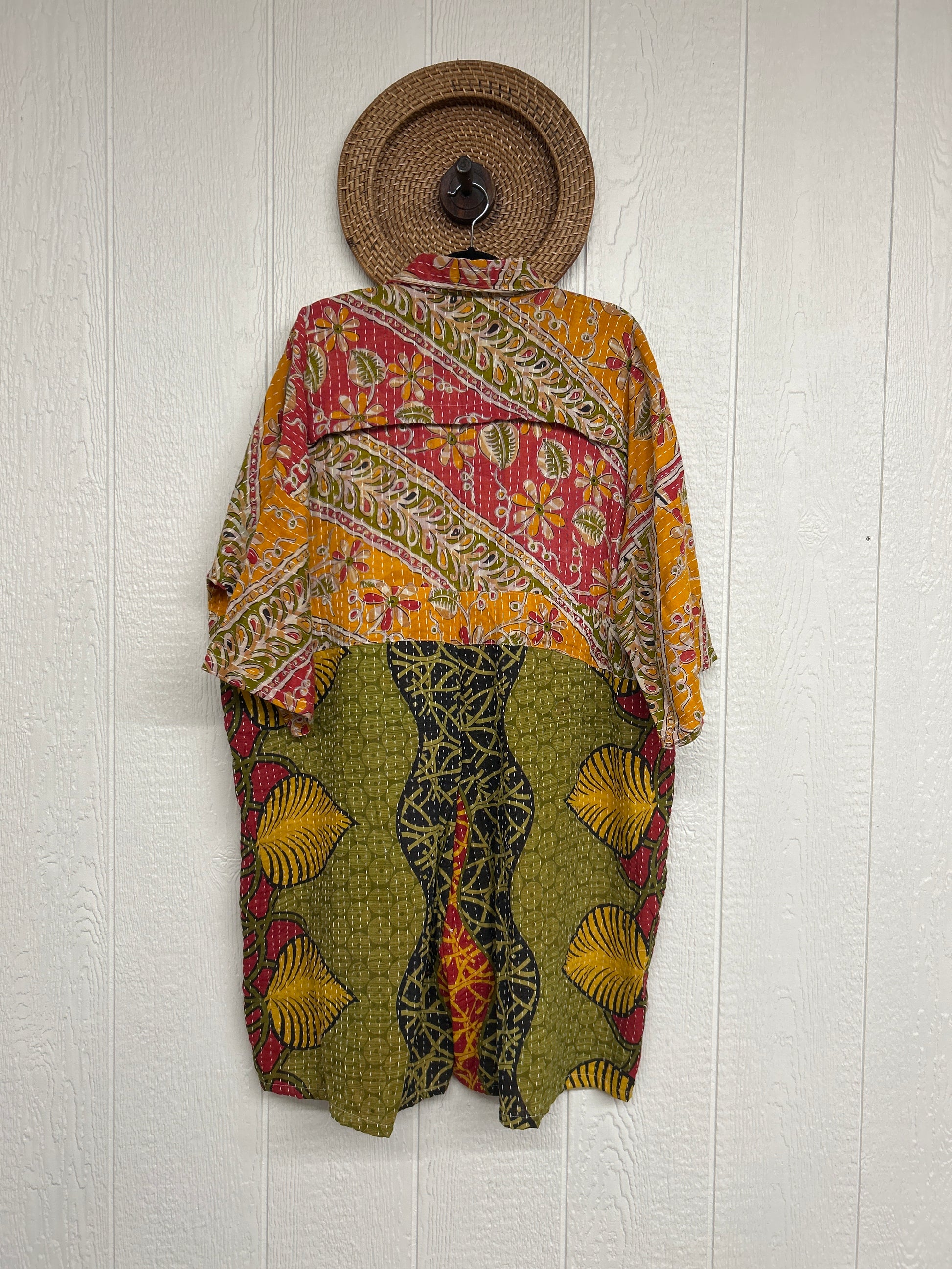 Fabrics may have small threads or holes in the layers. Color inconsistency or small stains may be present. The saris are sewn together and extend the life of each design. Imperfections should be celebrated.