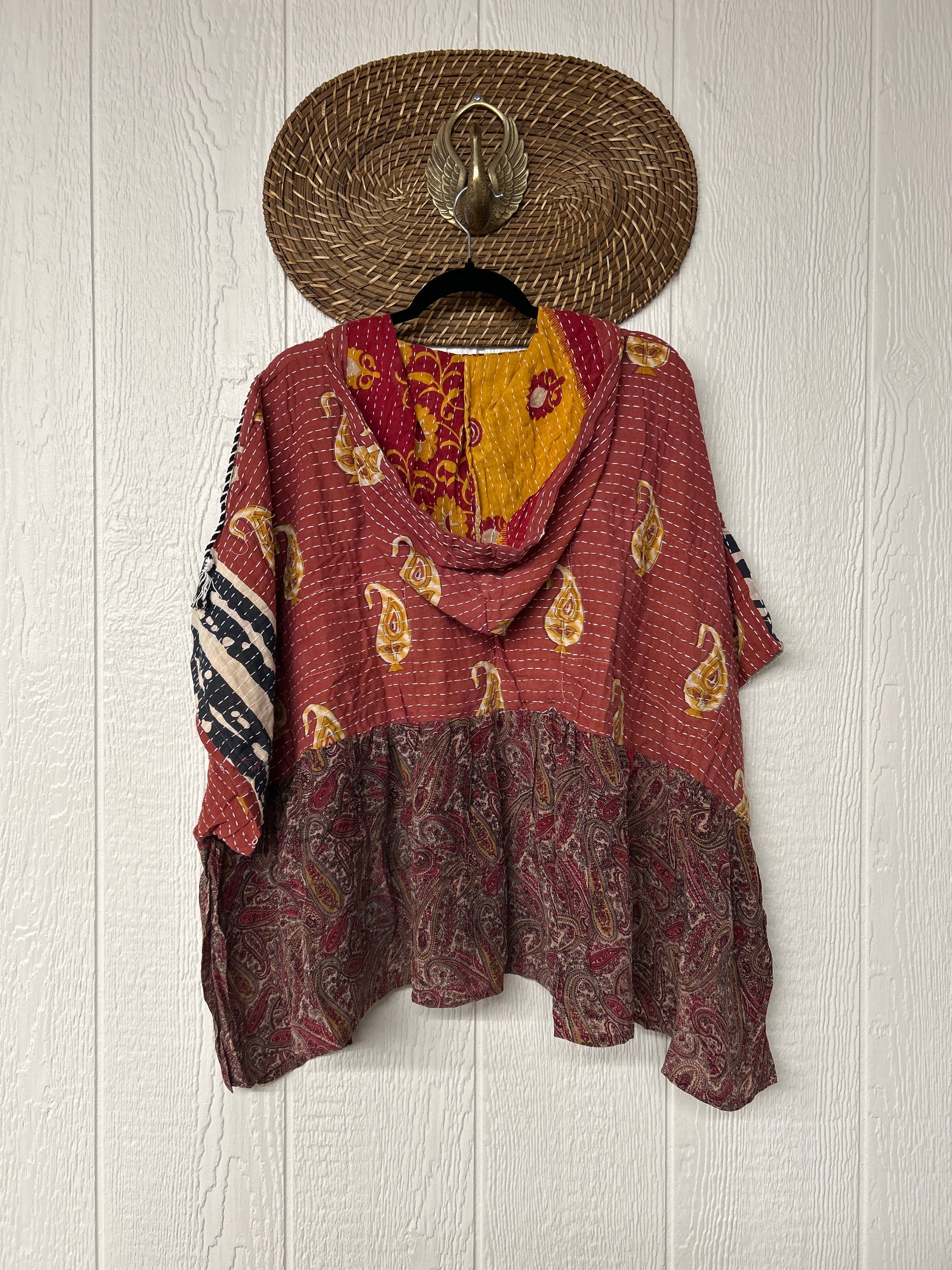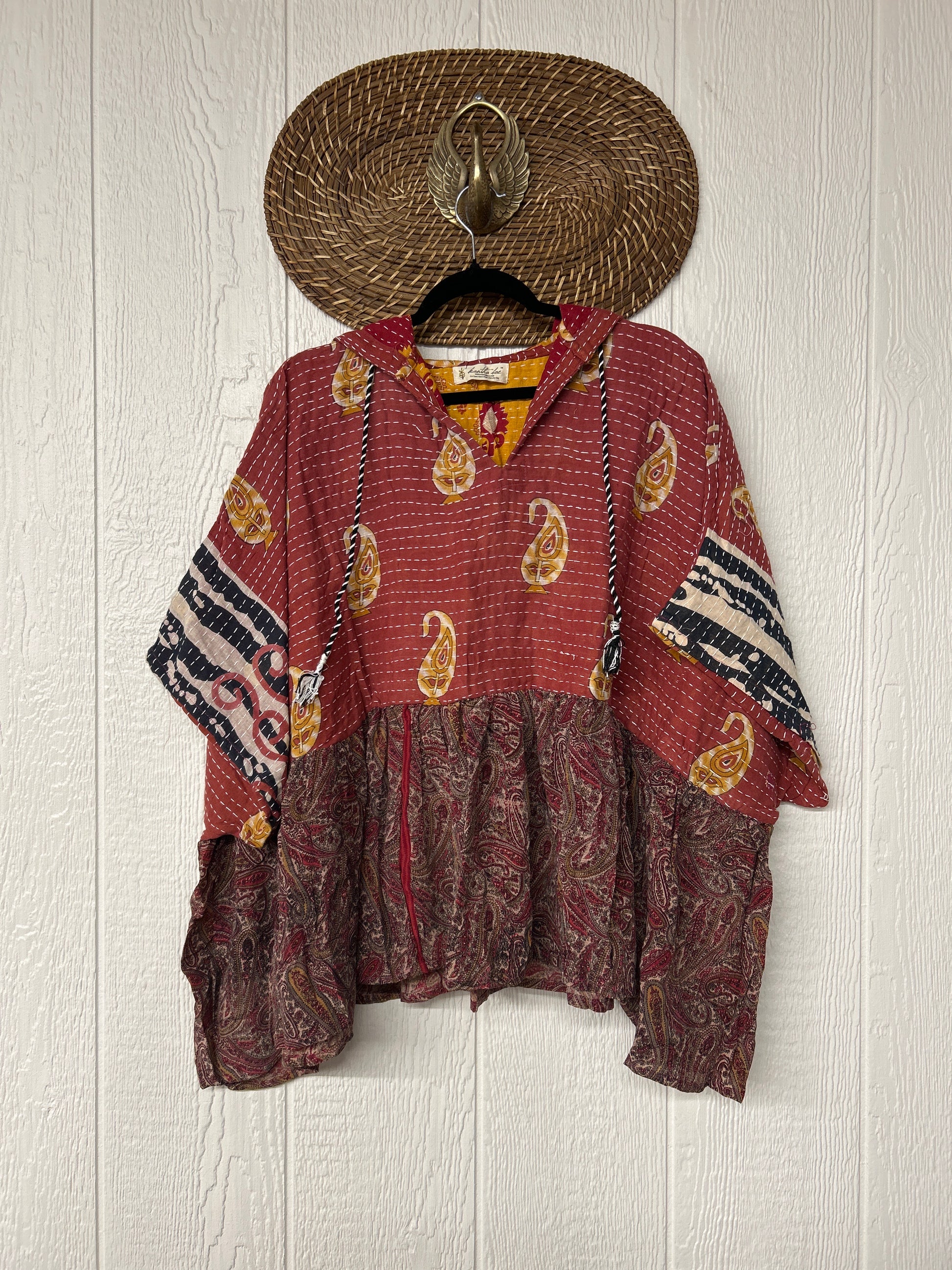 Your favorite throw on and go piece is made out of our vintage kantha embroidered sari with a crepe sari flounce. This poncho like silhouette is a flowy floaty dream.