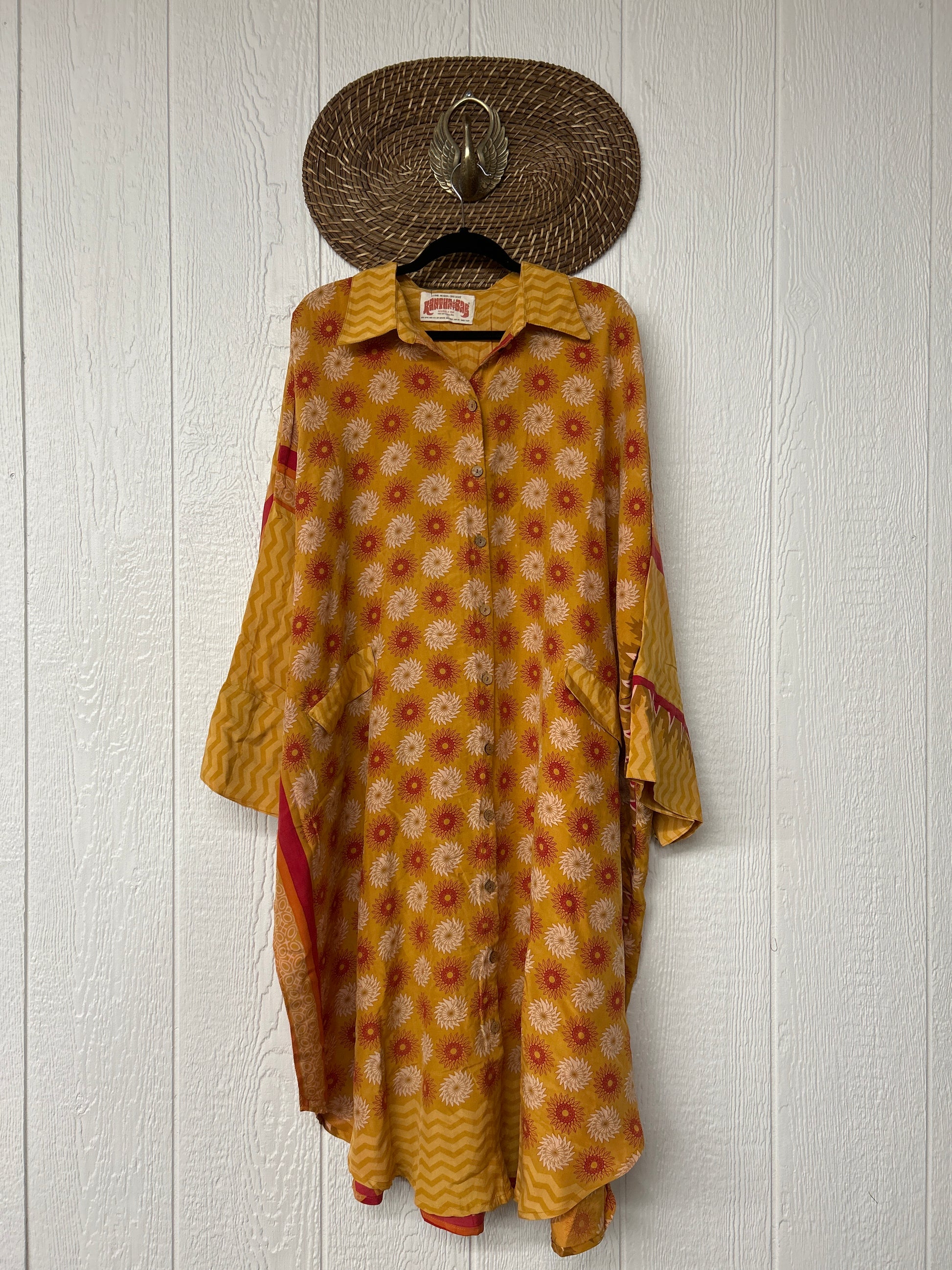 Made from our vintage crepe sari, this billowy dream functional buttons, two deep pockets in the front, dreamy longsleeves and a curved bottom.